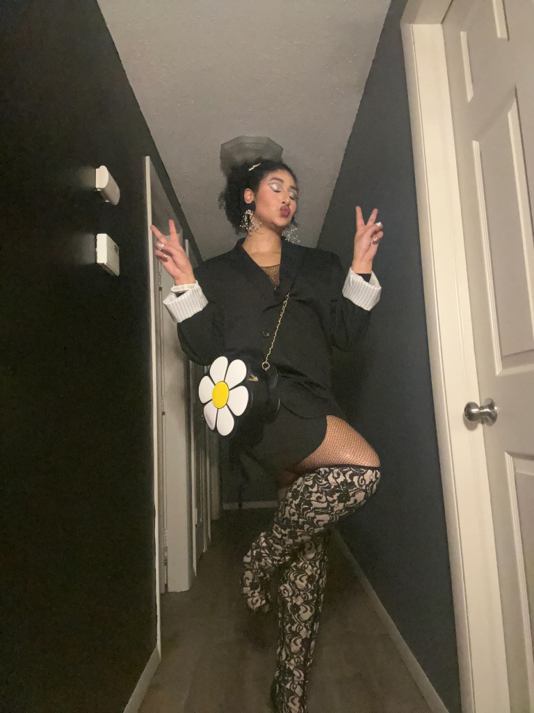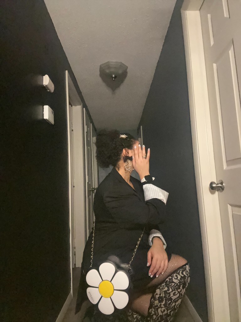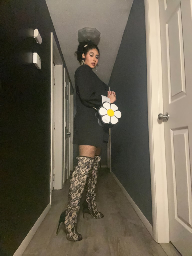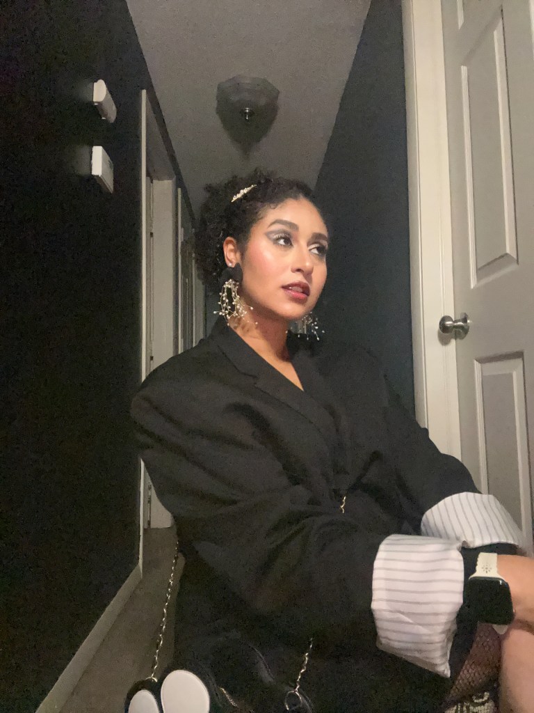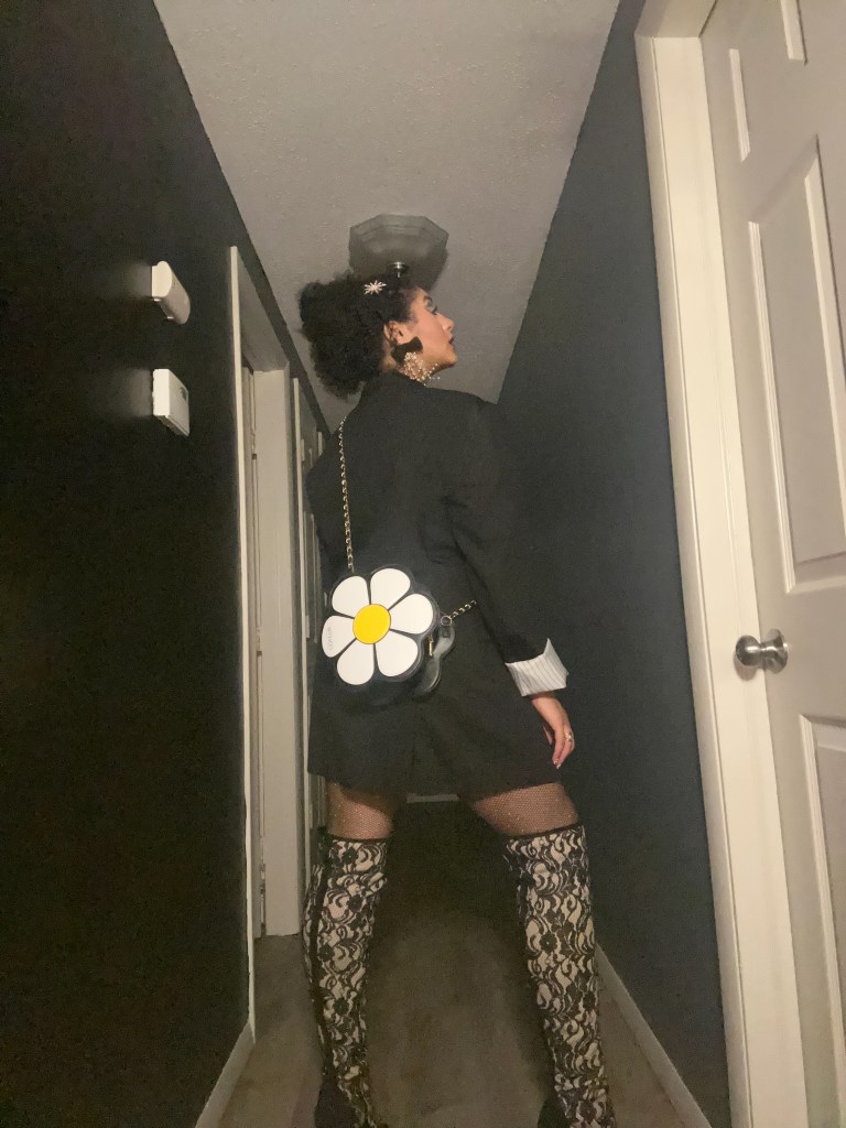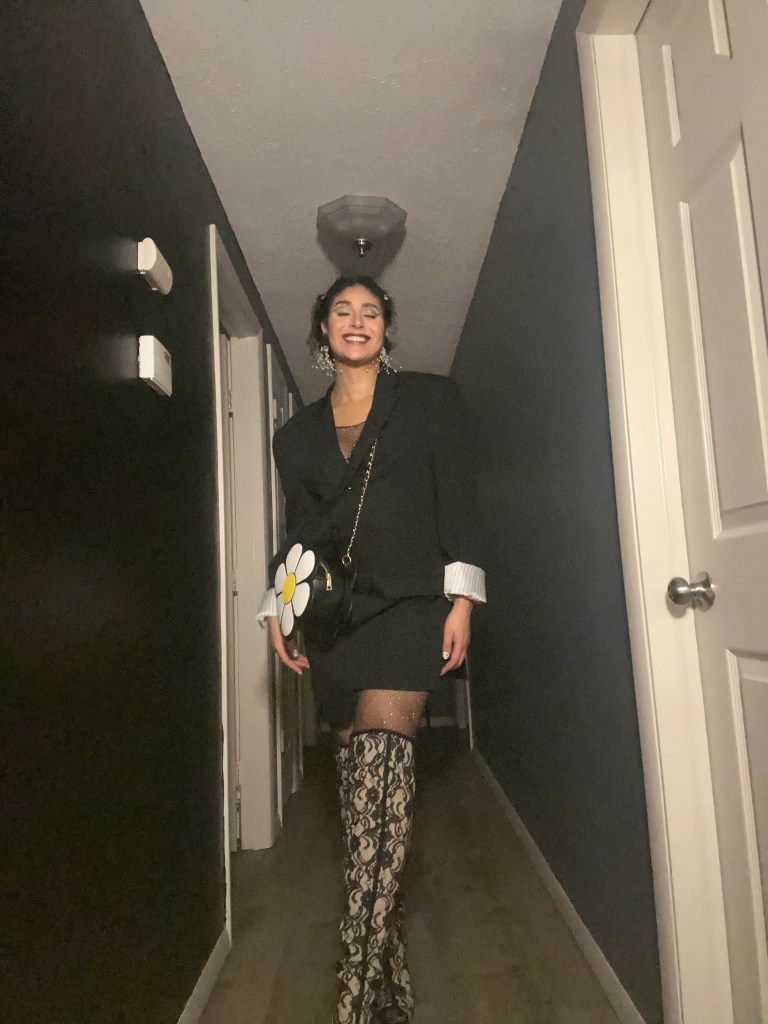 For New Year’s Eve 2024, I styled the catsuit beneath a men’s suit jacket, adding a pair of thigh high peep toe boots, a crossbody bag, and pearl earrings!