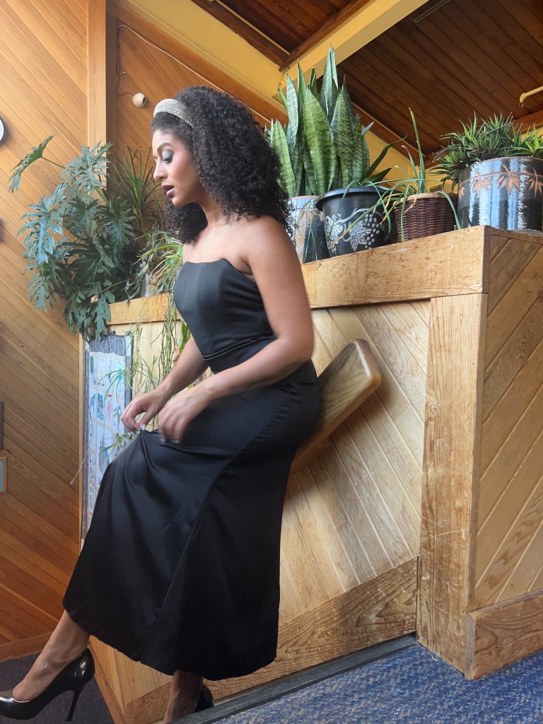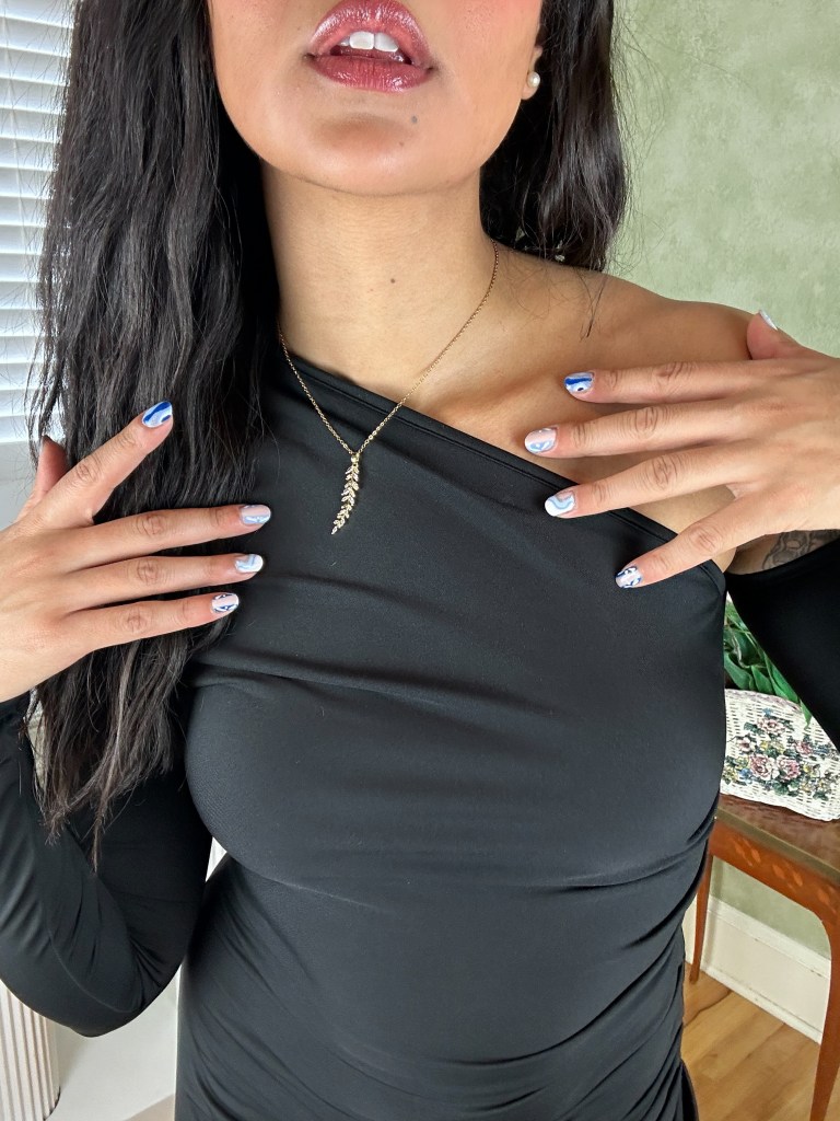 And finally, for the more dainty and feminine rhinestone feather necklace, I kept my look simple and elegant, pairing a pair of black strappy sandals with an asymmetrical black dress from SheIn.