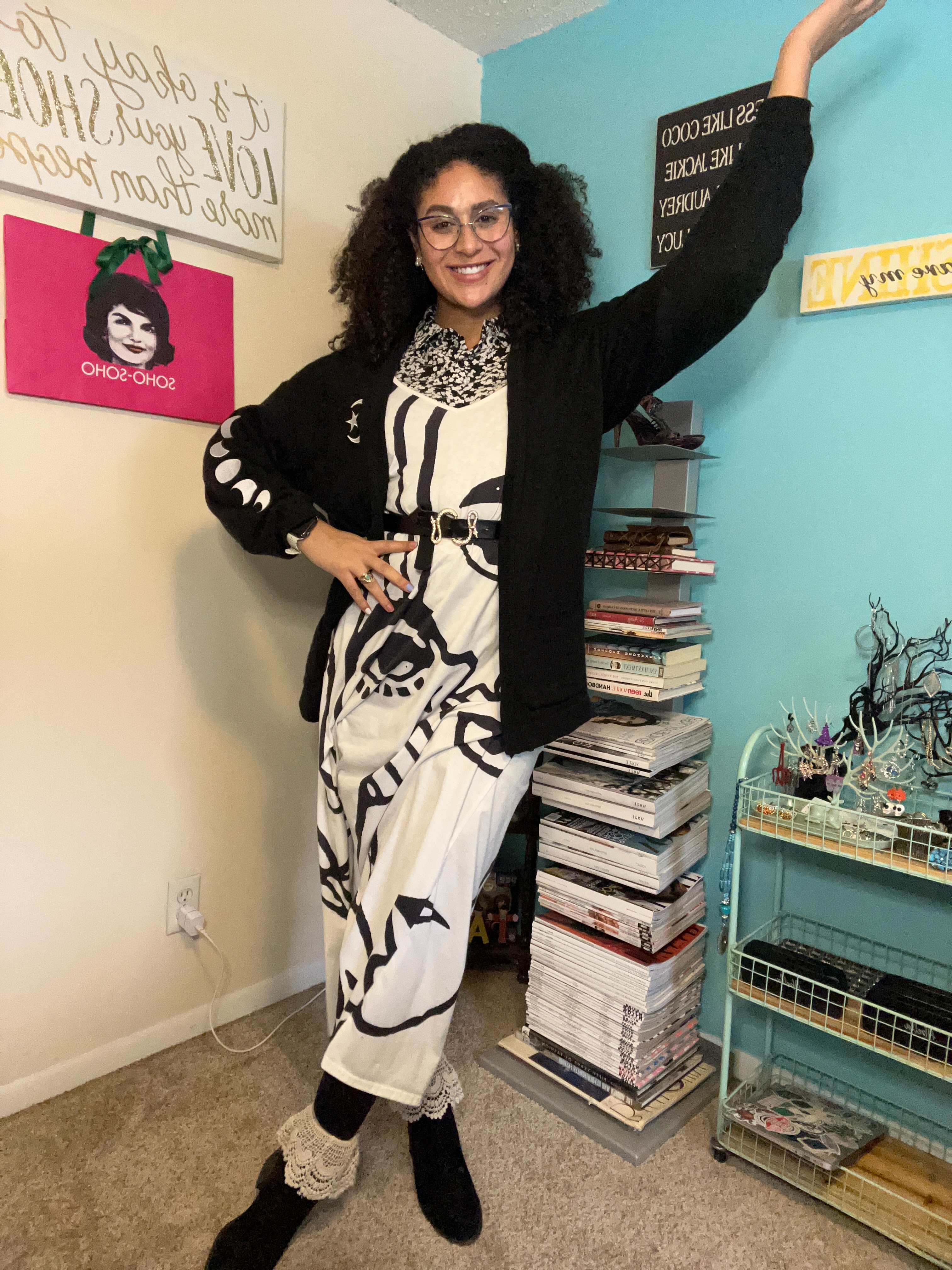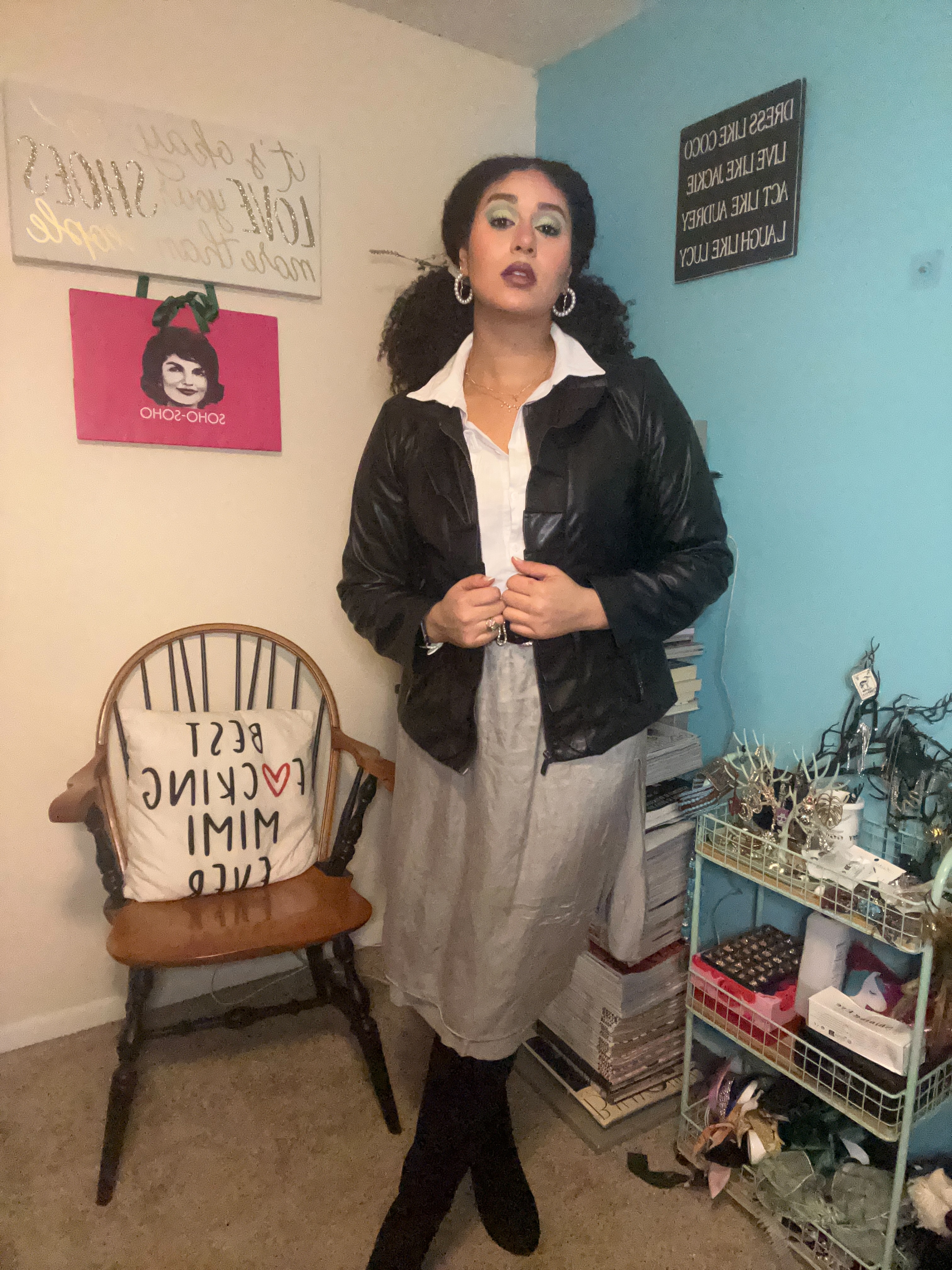 If you’ve read any previous post or looked at any of my social media, you’ll know that I love snakes! To me, they represent fluidity and meeting changes head on, and to me, that translates to a sexier outfit! Here I started with a maroon velvet bralette beneath a Theory blazer, paired with black tights and a Zara pleather skater skirt, and my first pair of Louboutins!