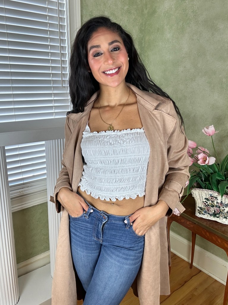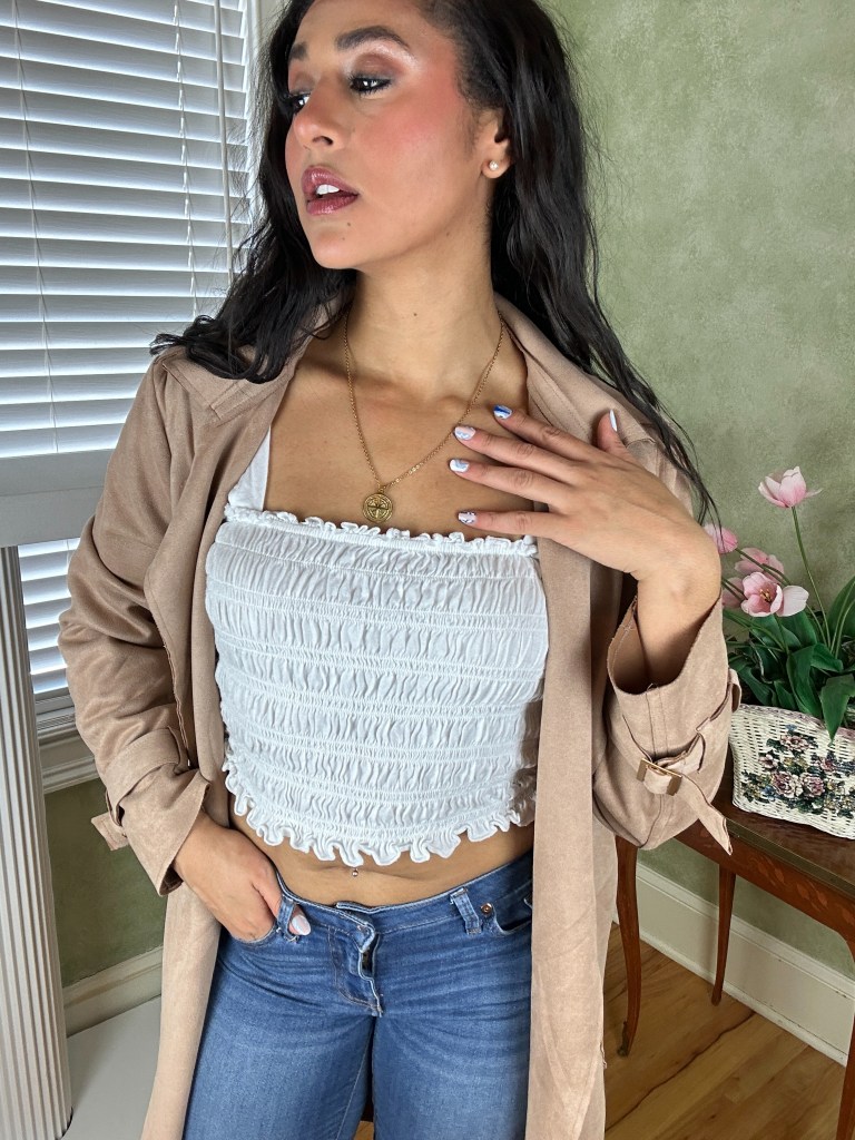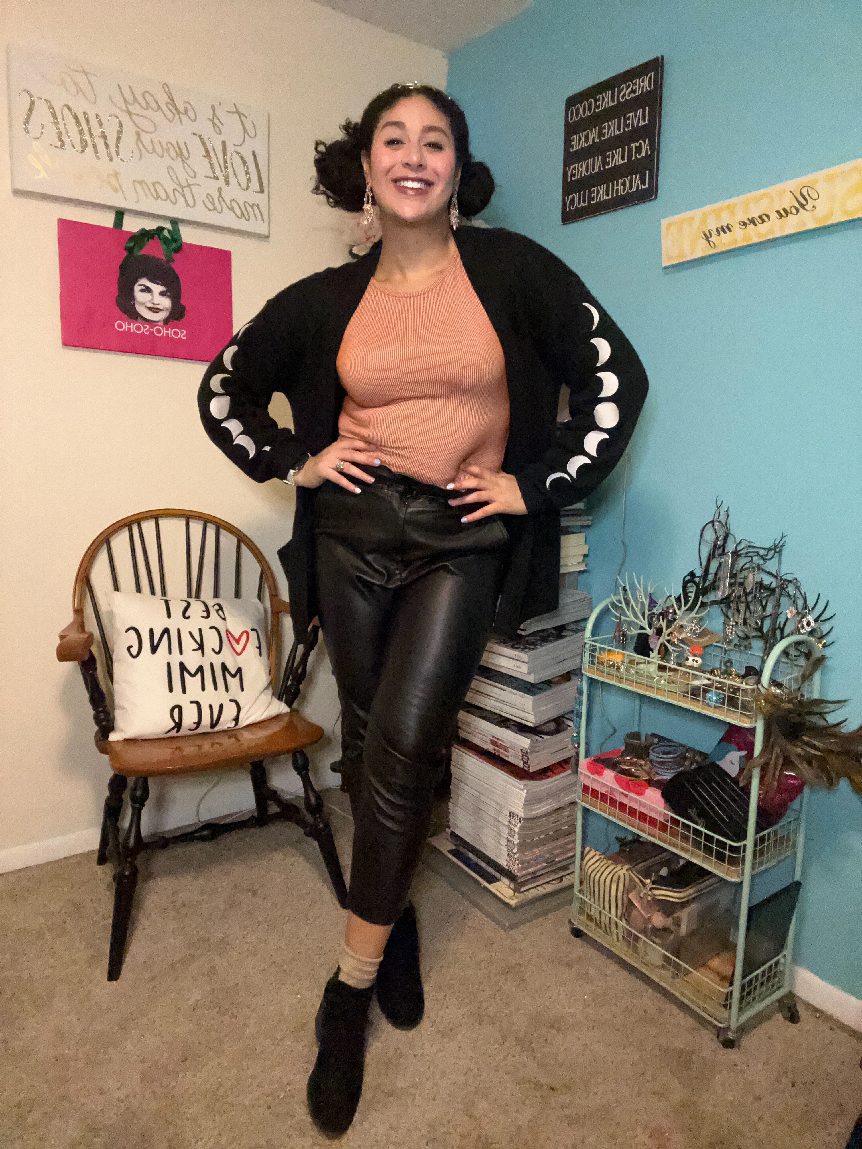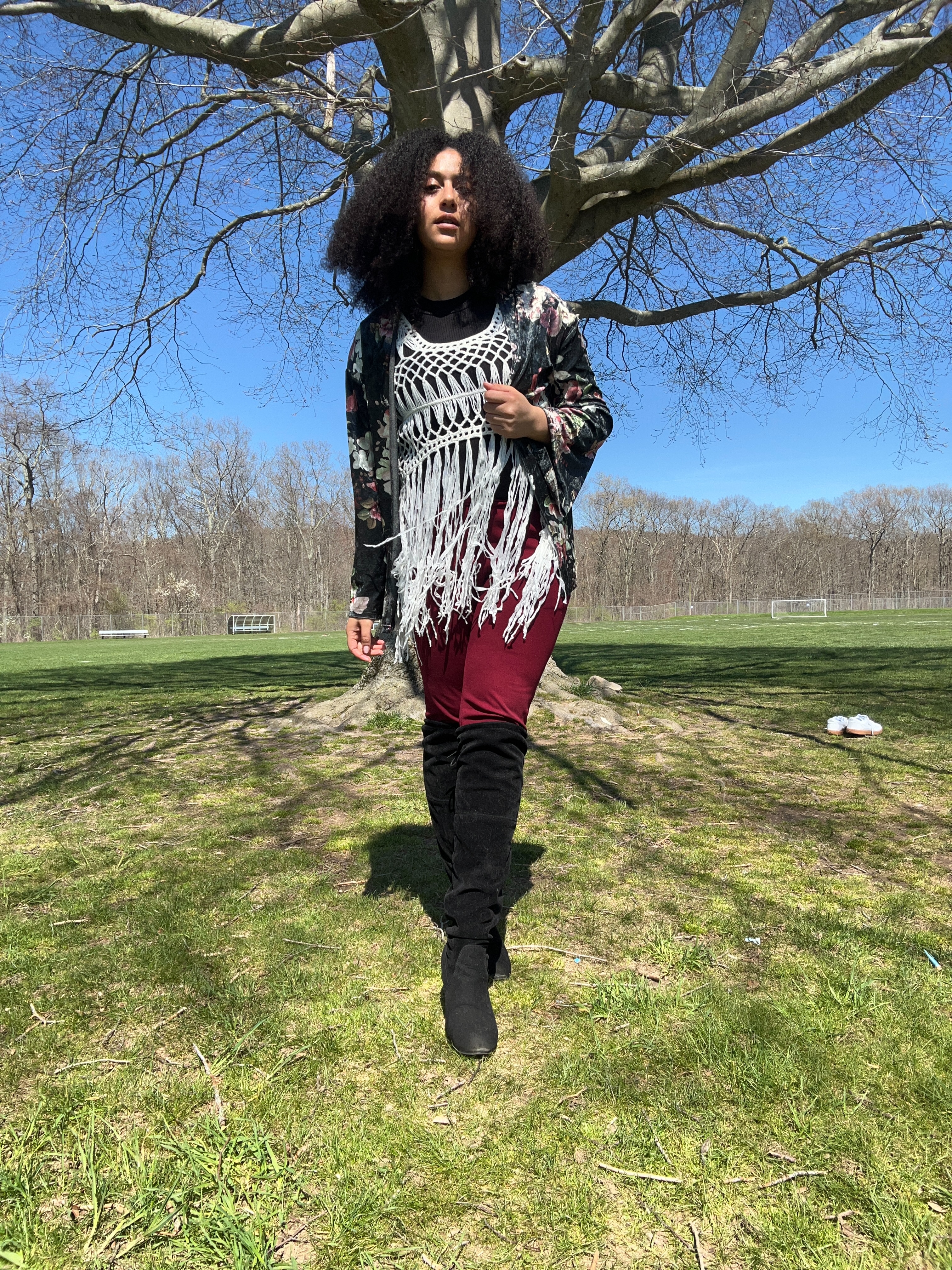 I paired the compass with a more laid back look, choosing a pair of Fashion Nova skinny jeans, an American Eagle crop top, a suede jacket by Love for Humanity, and a pair of boots by Franco Sarto.