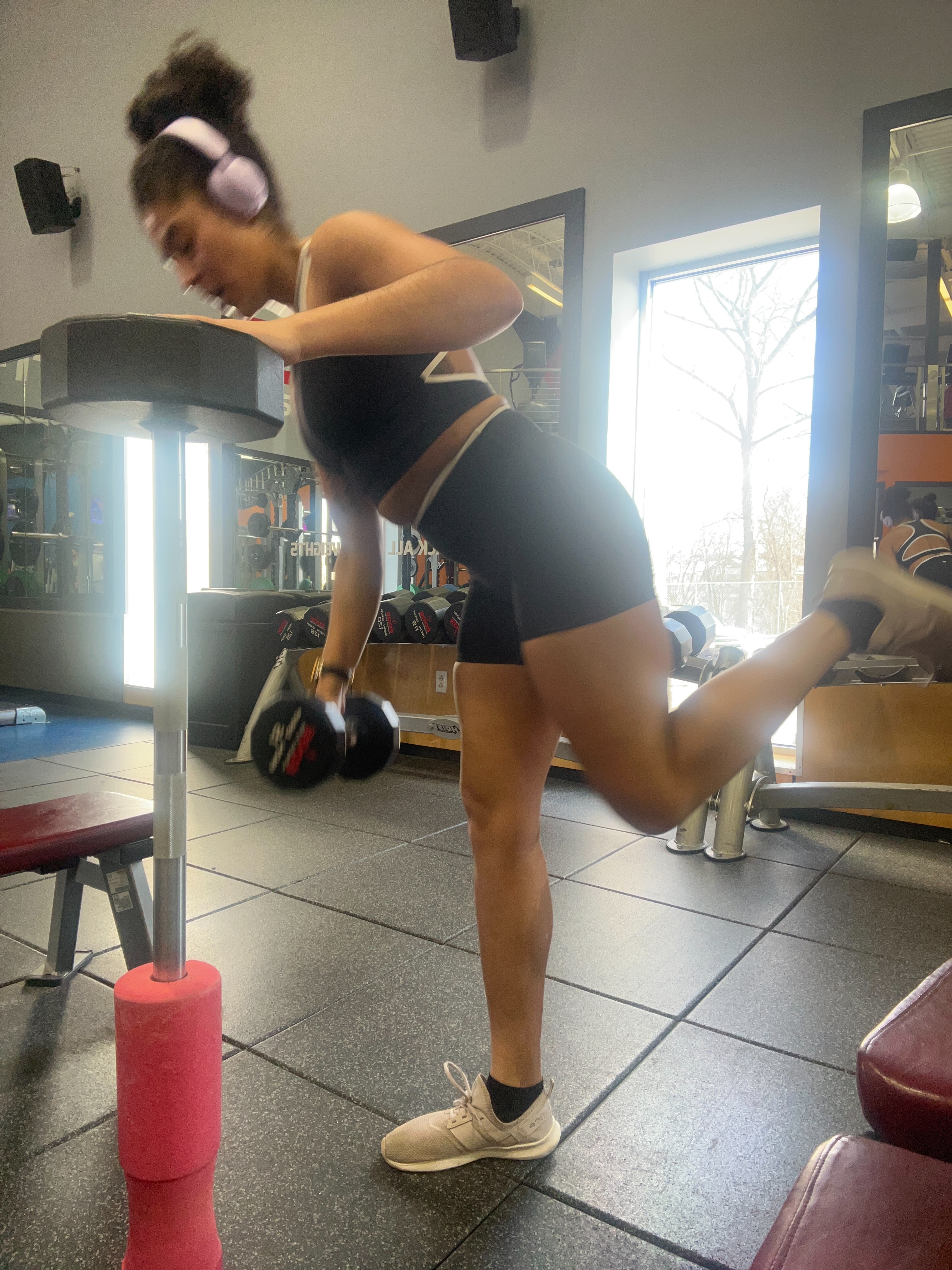 Similarly, some workouts require additional equipment, such as using a barbell pad when completing weighted hip thrusts, or using a thicker yoga block to complete standing split squats rather than the weight bench!