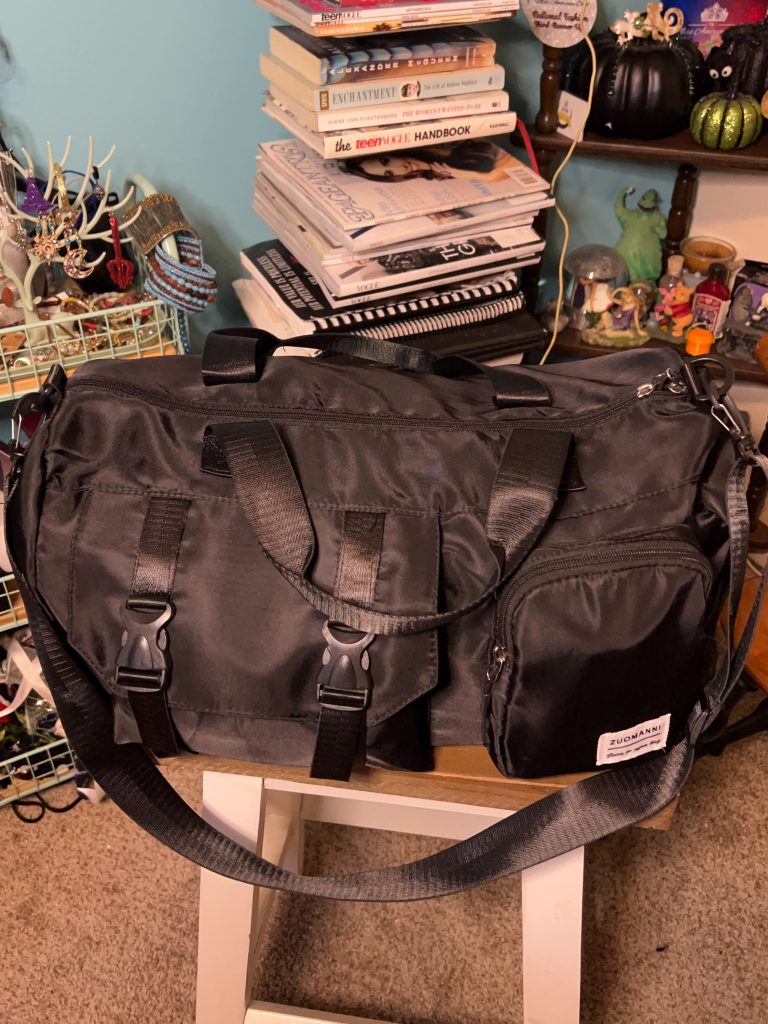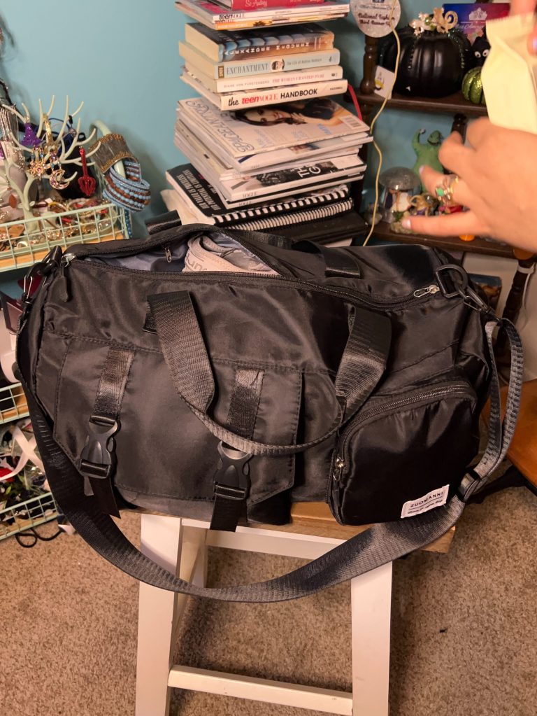 My standard gym bag – a black duffle back from Temu – features many pockets, a must-have for any bag that comes into my life!