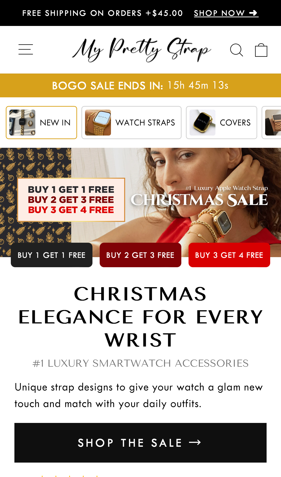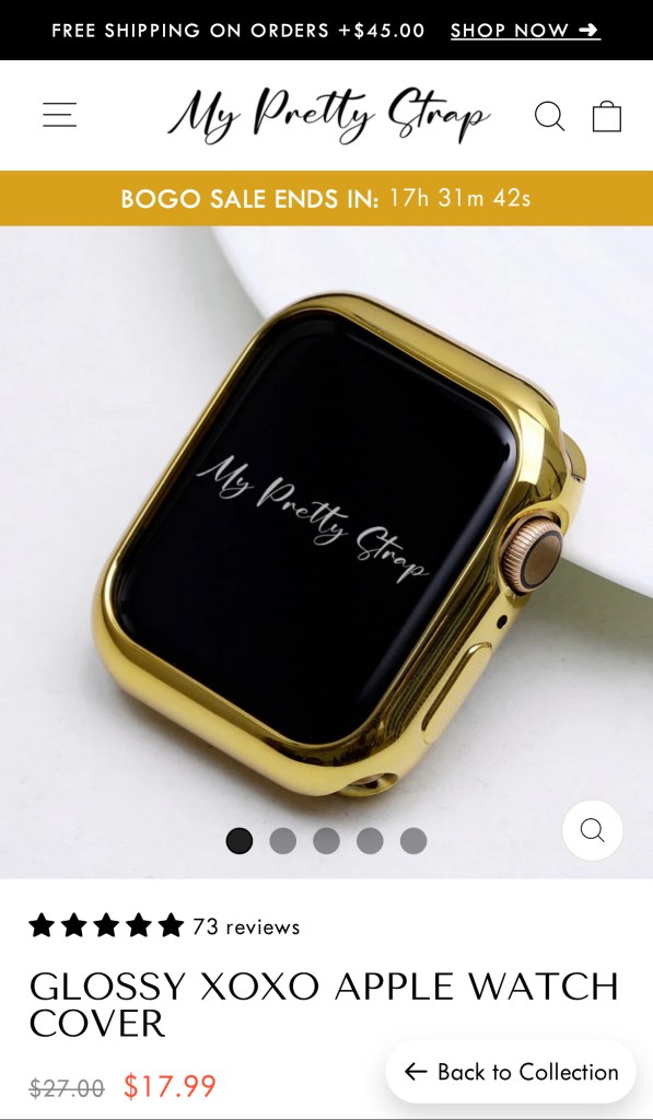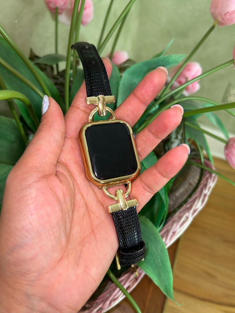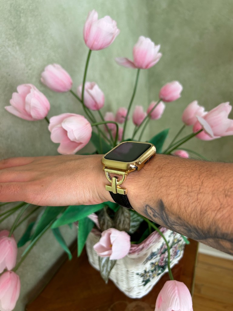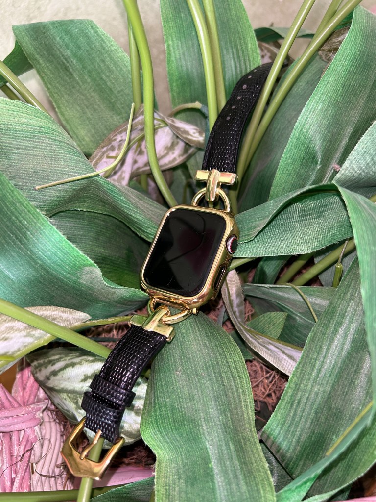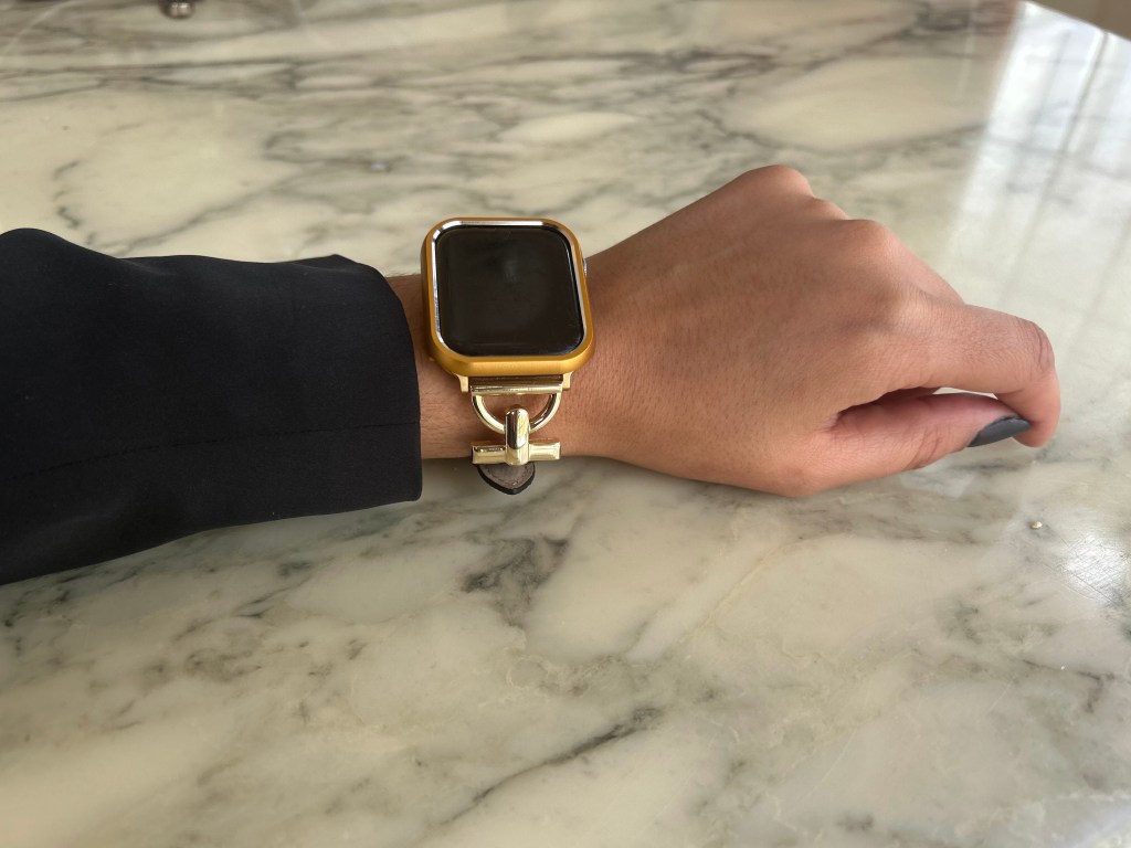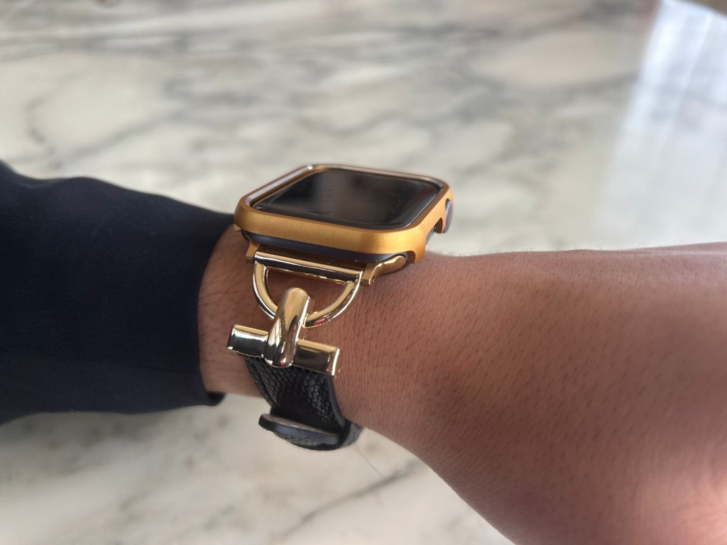After looking through their inventory I made three selections; two watchbands, one that I envisioned wearing daily (the Glam Leather Strap – $44.99) and one for formal occasions (the Women Luxury Apple Watch Strap – $34.99), and a matching watch cover (the XOXO Apple Watch Cover – $17.99) all in a gold finish.