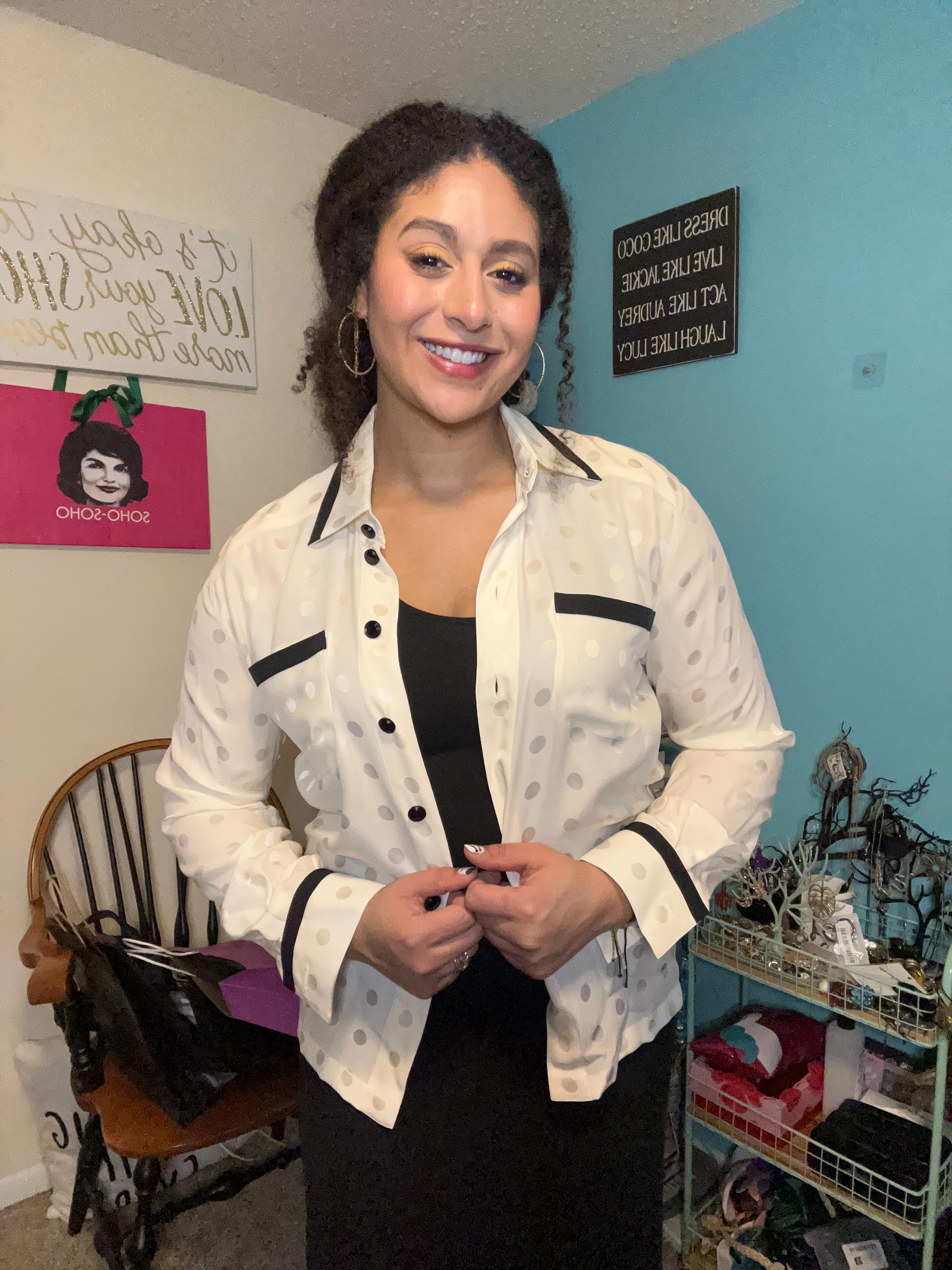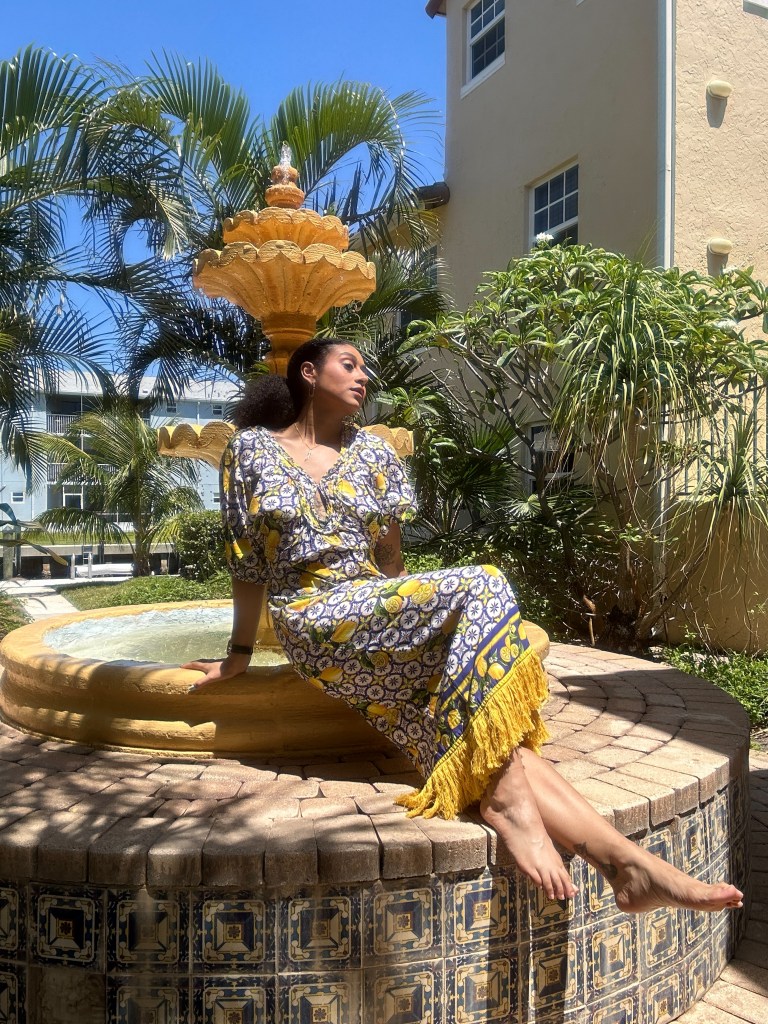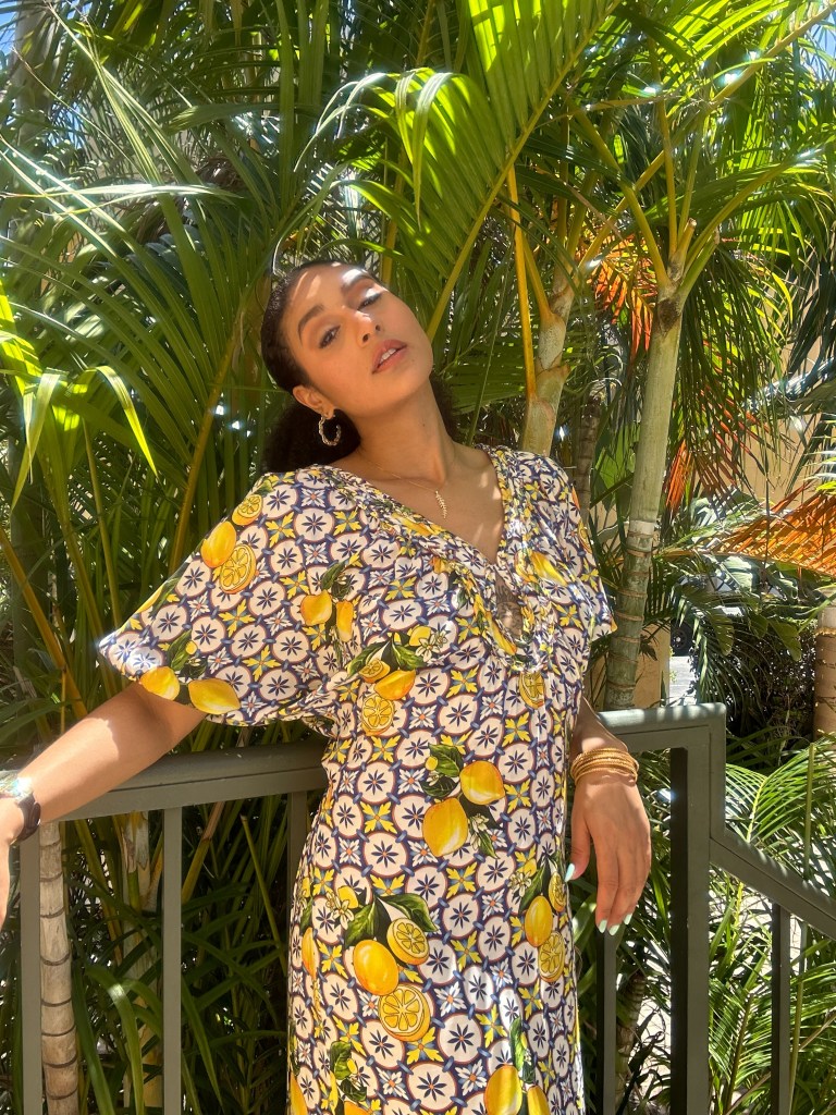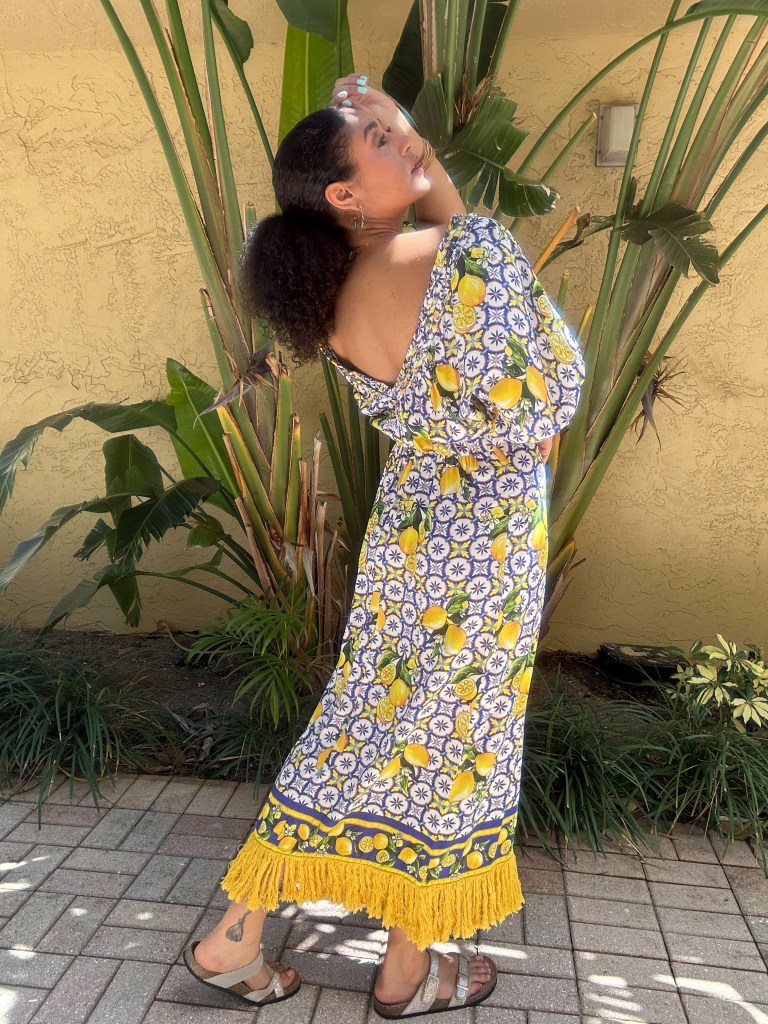 This year I found three knockout pieces – a blue-white-and-lemons printed maxi dress; an oversized blazer sporting a very subtle plaid pattern beneath clear micro-sequins; and the most beautiful gold necklace which features a mother of pearl heart and multi-colored Ishtar-star dangles!