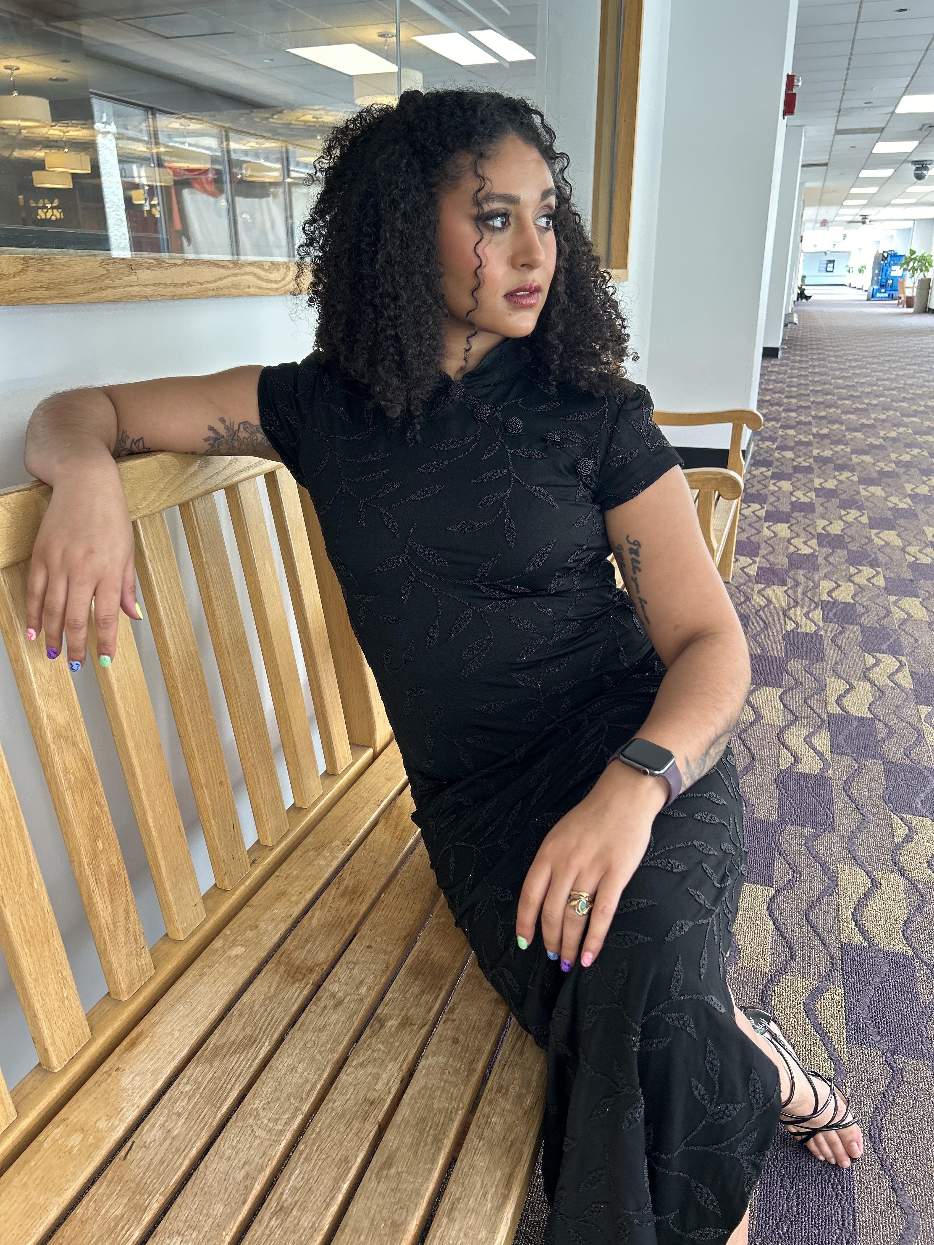 I ended up styling this dress as the stand out piece in the look, opting for the Lor Francais feather, a pair of gold leaf hoop earrings, gold bangles, and a pair of rhinestone sandals by White Mountain Footbeds that I recently found at T.J. Maxx!