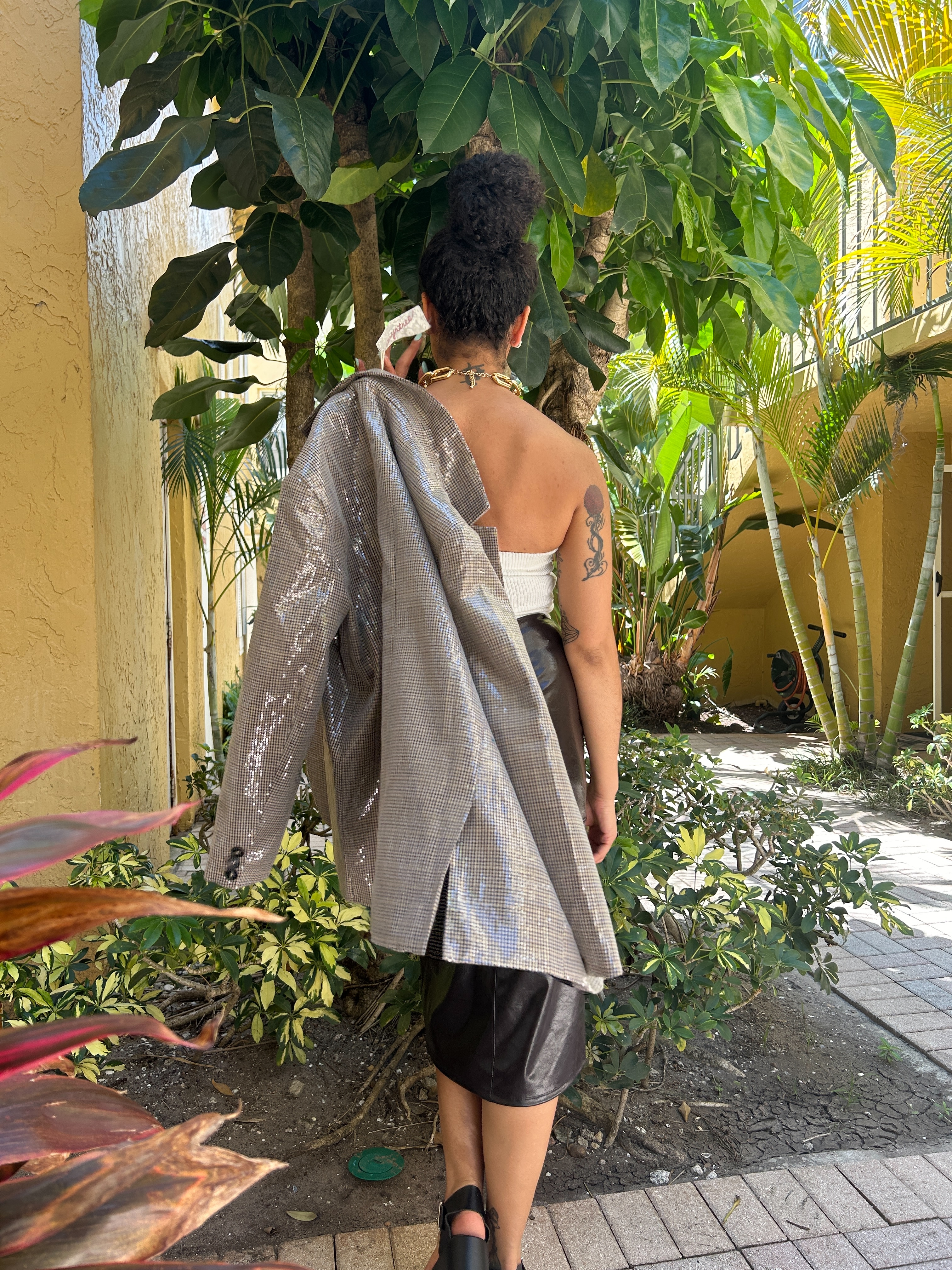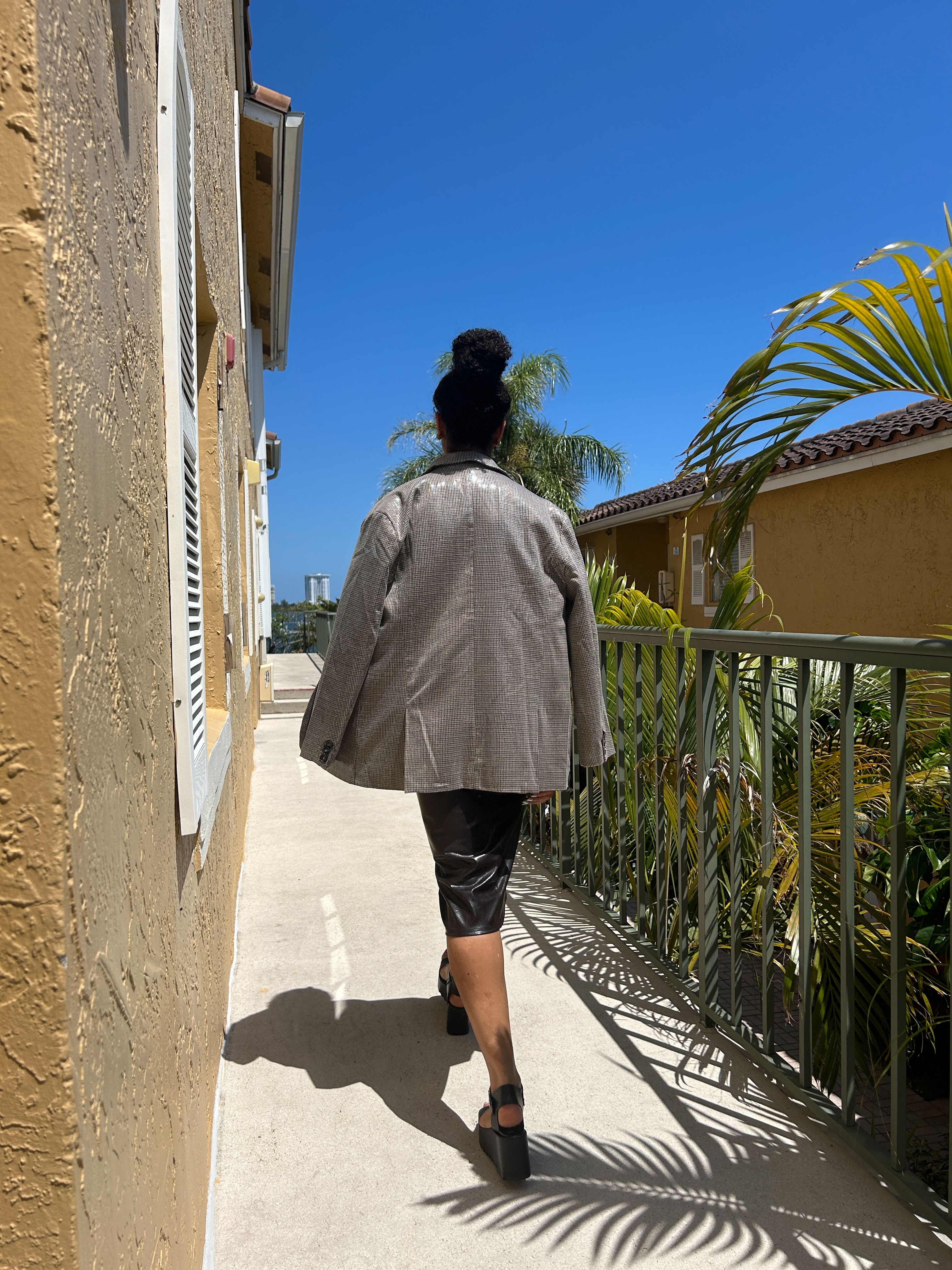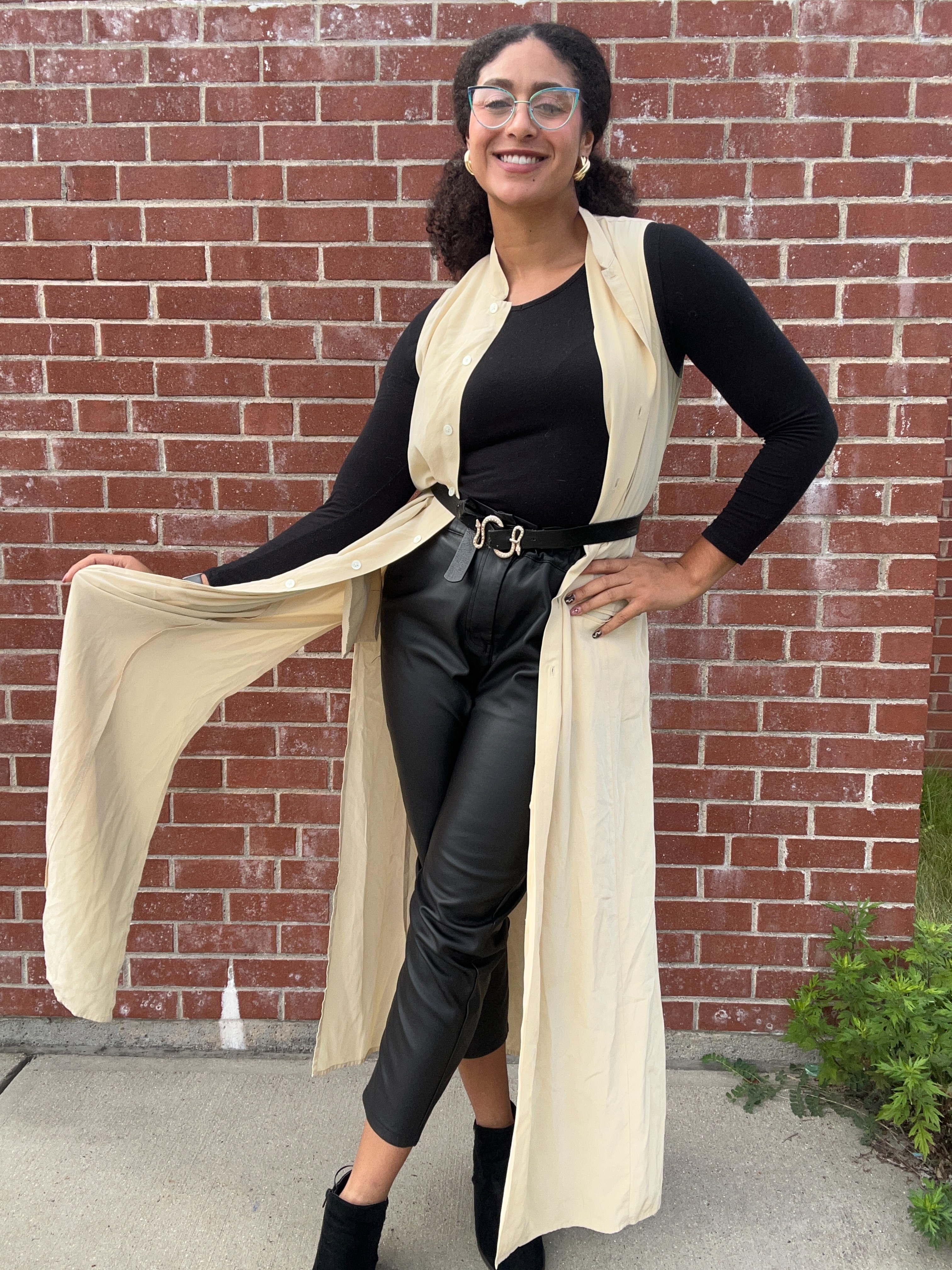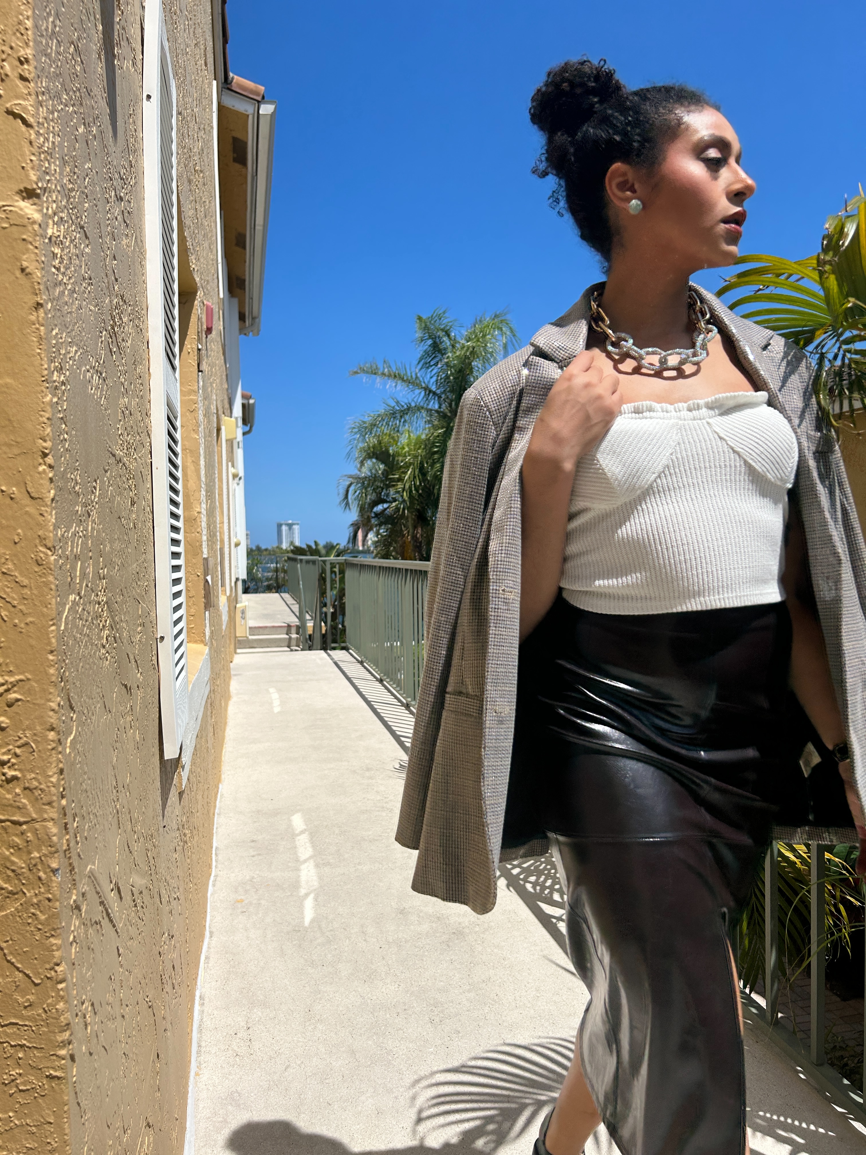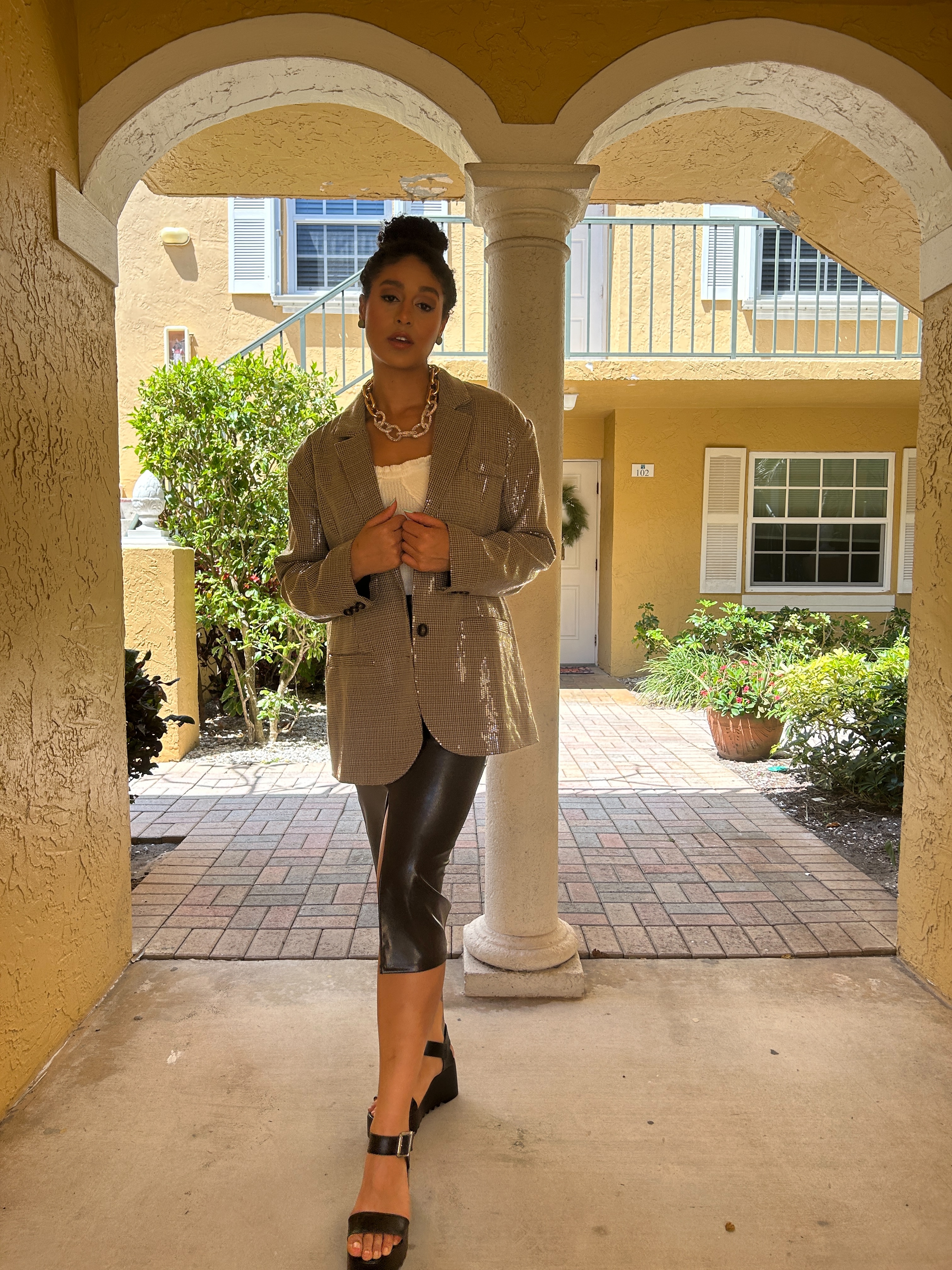 Do you ever sit on an idea for so long that you become convinced that it’s the right thing to do? That’s how I feel about this outfit, which admittedly, looks better without the blazer. In my head, the form-fitted combination of this knit cropped top and pleather pencil skirt – from T.J. Maxx and Target, respectively – would be the perfect neutral base on which the blazer would pop. But honestly, I think a pair of jeans and my caramel leather boots would look better. Here I opted for my Steve Madden platform sandals, the rhinestone and gold link choker from Renee’s Resale Clothing Outfit and a pair of the button earrings that I got at V.M.D’s!