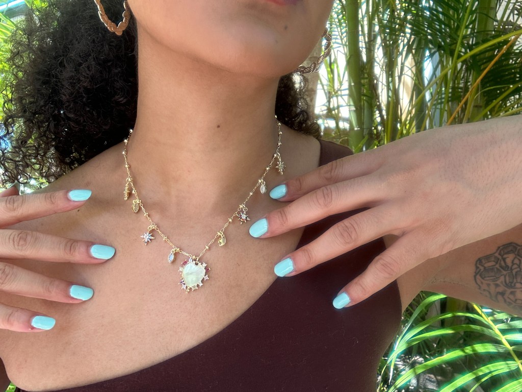 I was drawn to this necklace for many reasons – the necklace chain has many length settings, from a super tight choker to a dangle that falls right beneath my collar bone; the graceful femininity of the mother-of-pearl-heart; and these eight pointed star dangles, a symbol associated with my favorite Goddess, Ishtar!