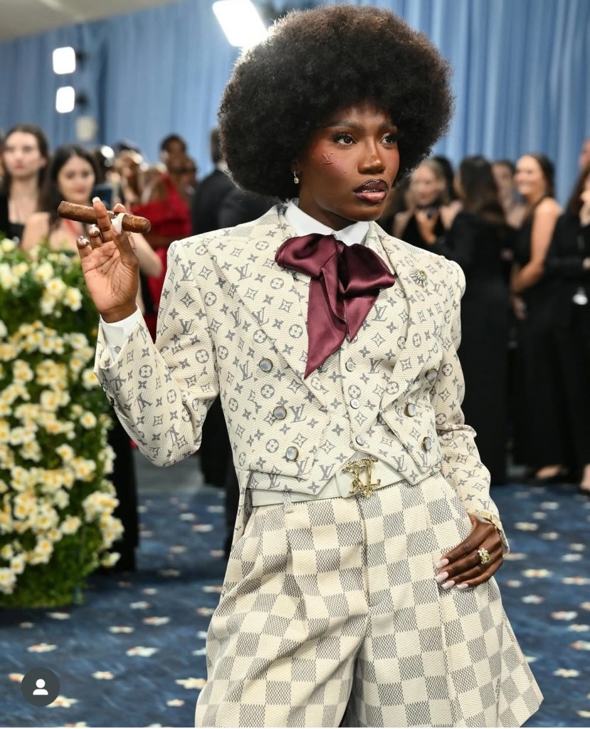 While I’m not the biggest fan of her music, there was something so adorable and innocent about Doechii’s custom Louis Vuitton look. I appreciate the overall simplicity, and the detail of having the LV logo seemingly embossed on her cheek!