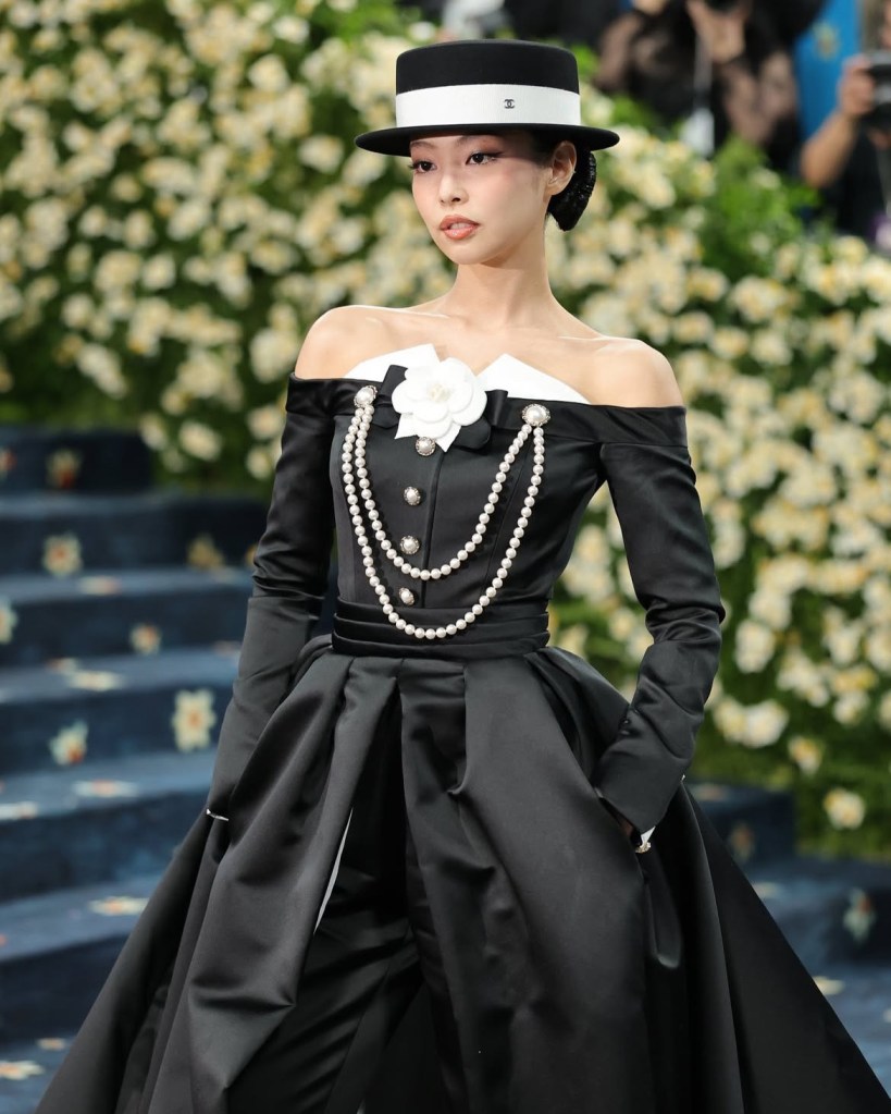 Jennie, member of BlackPink, looked elegant and chic in Chanel. I loved the exaggerated detail of the skirted jacket over the tuxedo pants, and that she kept her accessories to a minimum opting to let the pearl detail on the jacket – and the hat – speak for themselves.