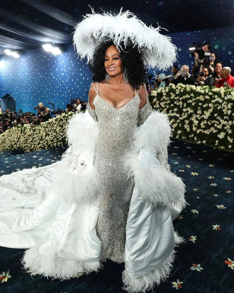 This year’s Met Gala carpet itself was a stunning shade of blue, decorated with white daisies and lined with hedges of the same flowers. The evening opened with a performance by the Silk & Sound Choir, and kicked off with the Queen of Elegance herself, Diana Ross!