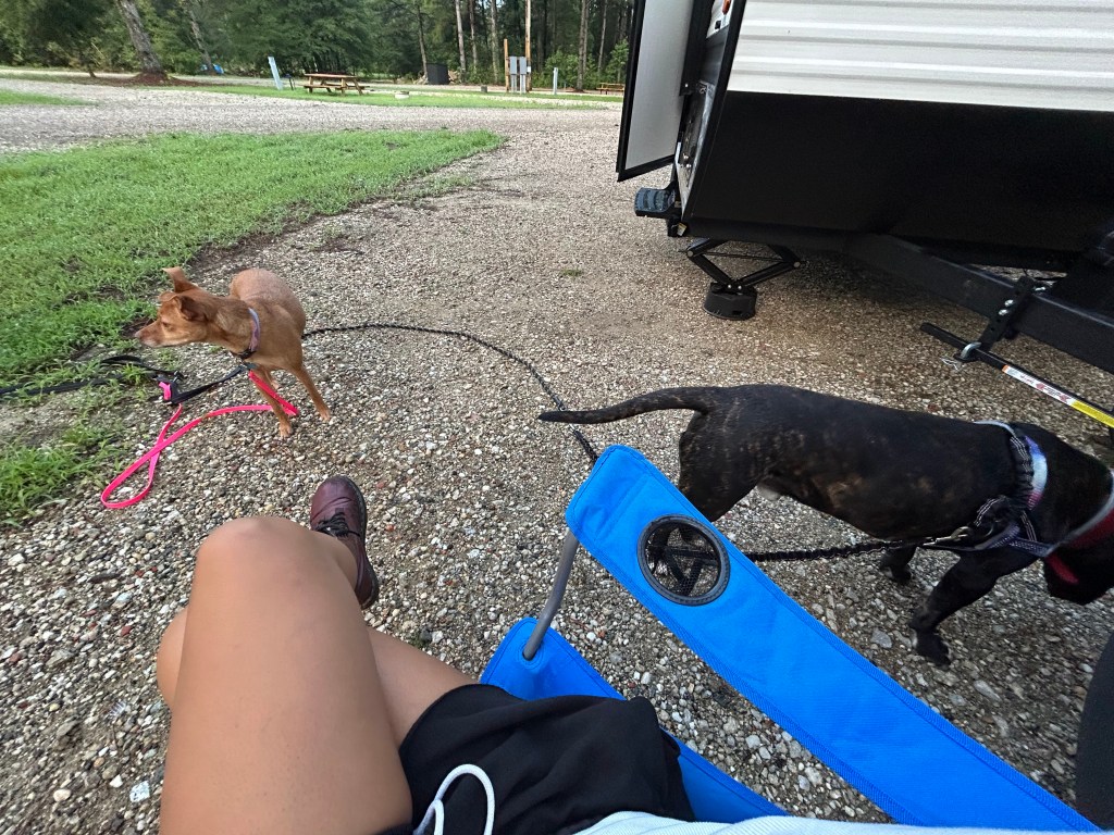 Luckily our camper had an AC unit because the dogs ended up needed several cool-down breaks! And, if you’ve seen my social media, you’ll have noticed that Dante loves the water – I erred in not packing his kiddie pool (a hard plastic one I got him last summer), and we ended up having to go buy him one; but his doggie bestie, my mom’s dog Mylee, HATES the water! So we had to keep an even closer eye on her to make sure she didn’t over heat