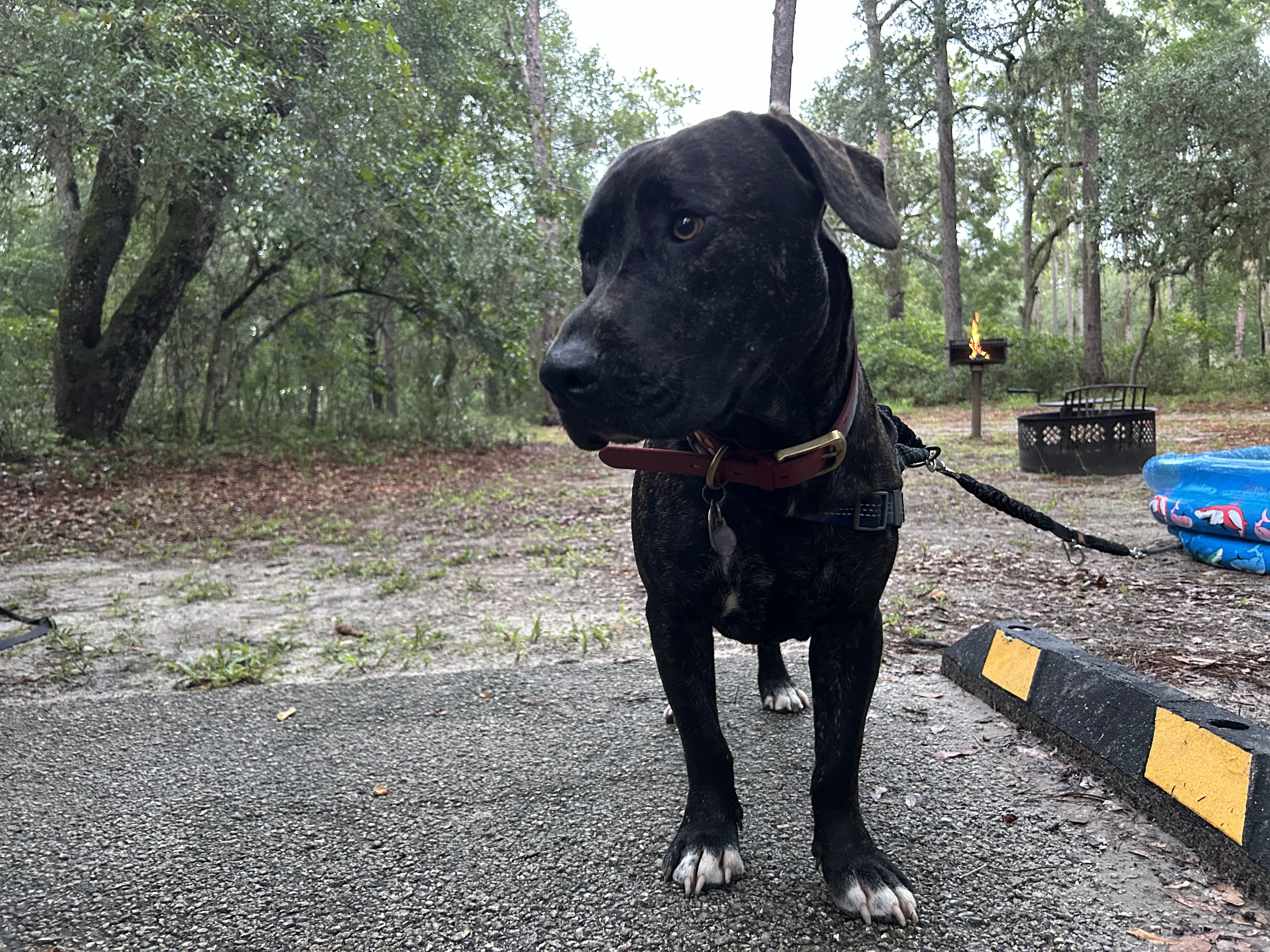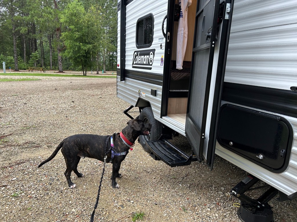 Dante, my (nearly) two-year-old Pitbull/Black Labrador mix, has been traveling with me for the last year. As his age and breeds indicate, he needs and enjoys vigorous activity! I brought all of the things we would need to go on long hikes through the forest, but with the tropical heat wave we experienced, we didn’t go hiking once! Instead, our group opted for frequent, short walks around the campgrounds, with ample opportunities to cool off in the AC and drink lots of water!