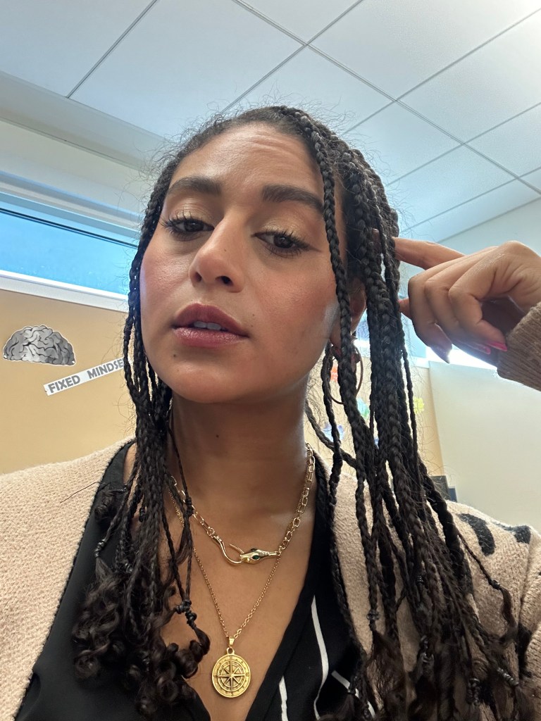 In my “Creative Hairstyles – Part Two!” I shared my process for creating two strand twists, a style I’m still learning and perfecting. But, once I figured out how to keep them (mostly) even I ventured into braiding! On my first attempts, I braided my wet hair directly after washing, just like I did with my two strand twists. But, earlier this year I had the game-changing idea to blow my hair out first; keeping my hair sleek and smooth in the braids, while also maintaining the length I crave!