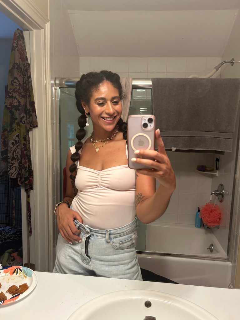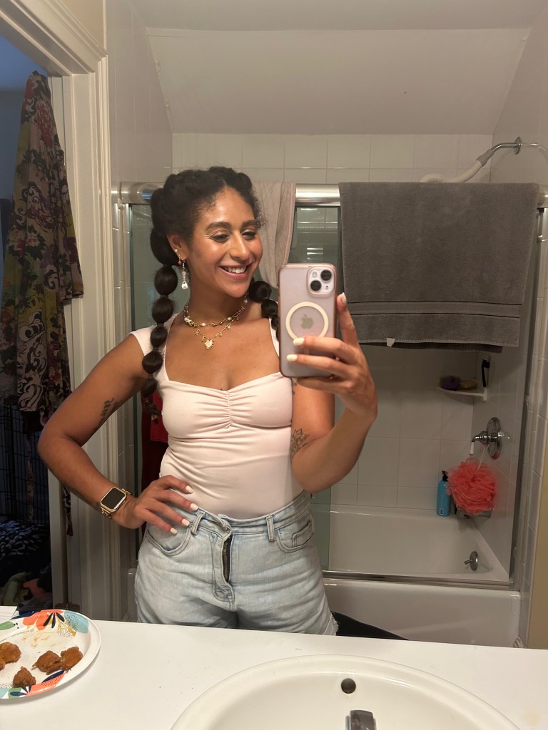 There are many ways to achieve this sleep look, and all you’ll need are a few items: one or two hair ties, bobby pins, some sort of comb or brush, and a product of your choice such as gel, a deep conditioning mask, oil, or whatever you have on hand!