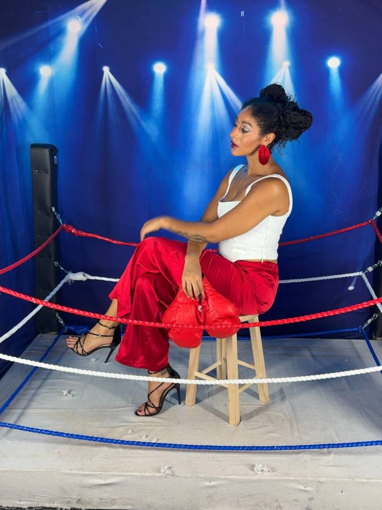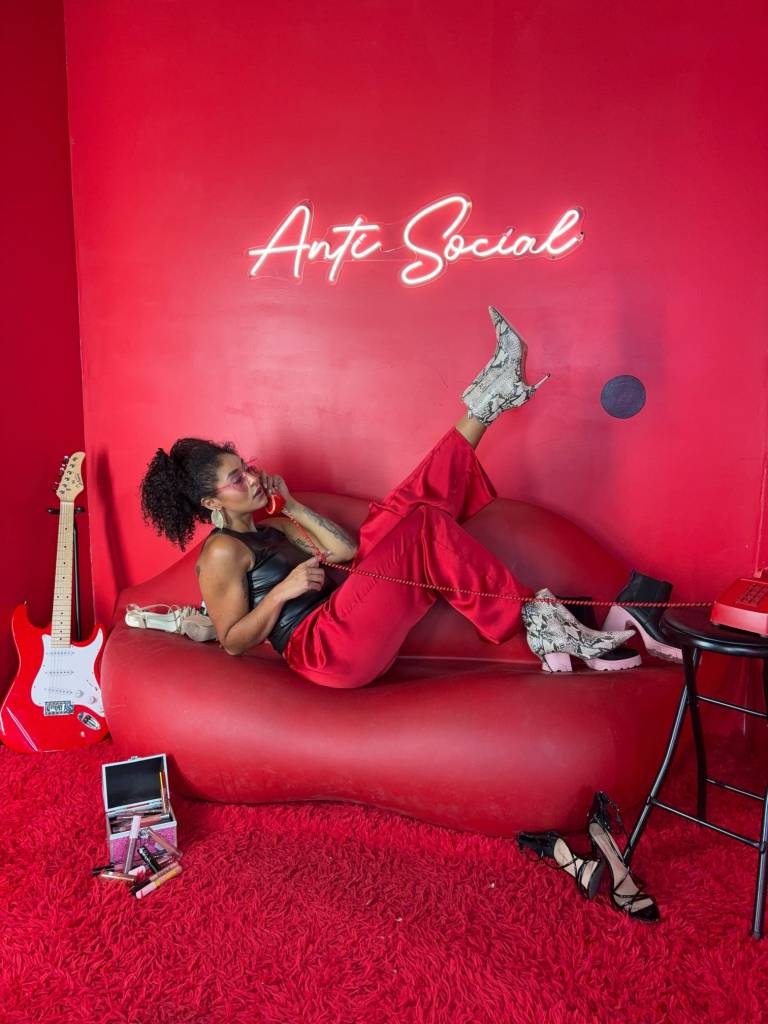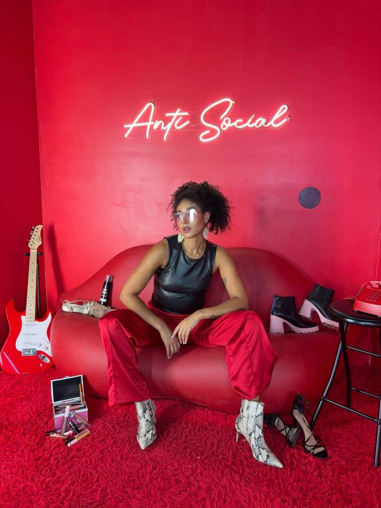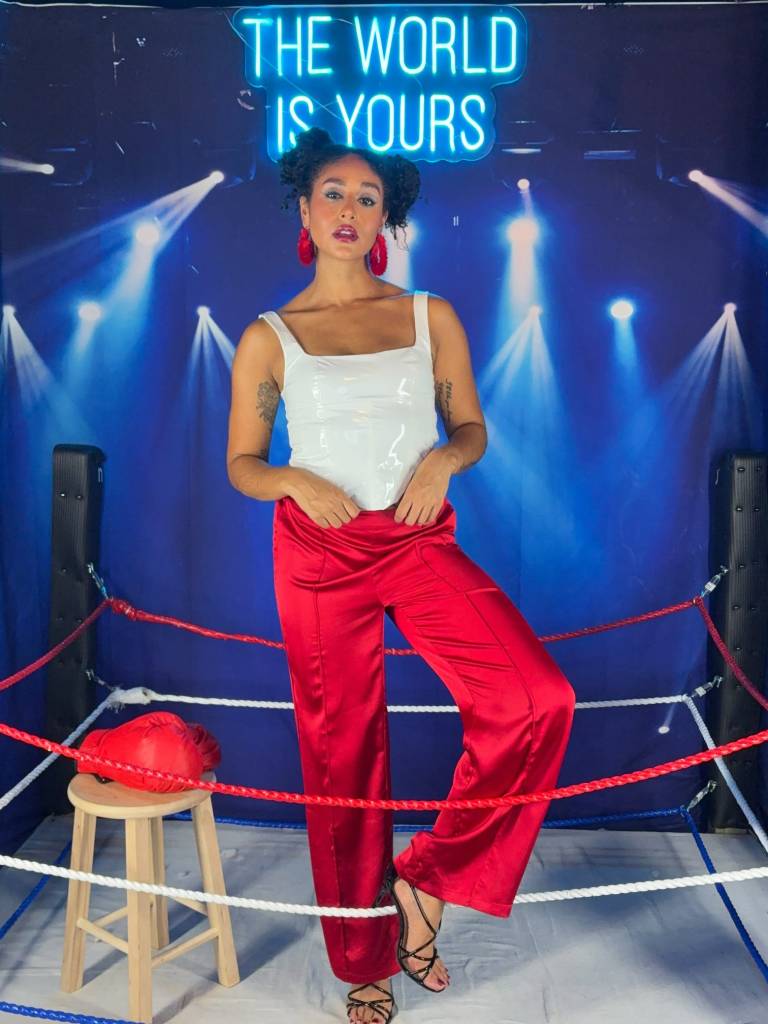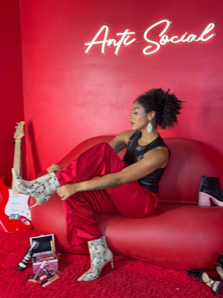 I wasn’t sure I was going to like this backdrop, but Stacey styled this look – the red satin trousers and a white latex top that I found at the Plato’s Closet in Palm Beach Gardens, Florida! I finished off the look with my go-to black strappy heels and space buns.