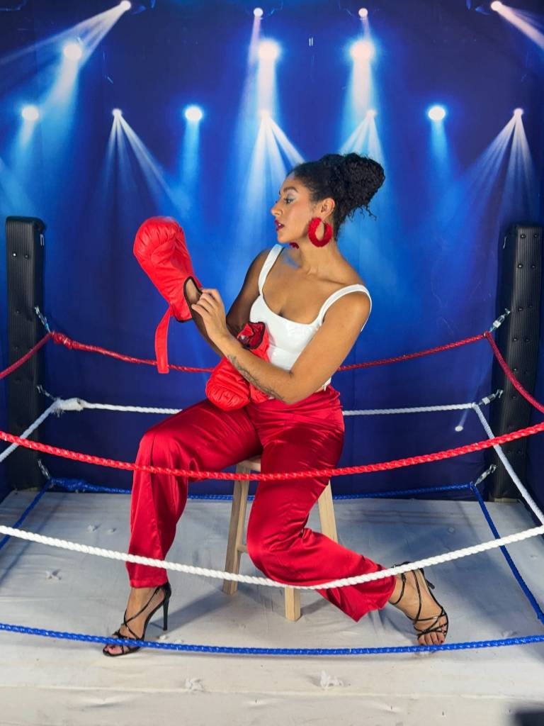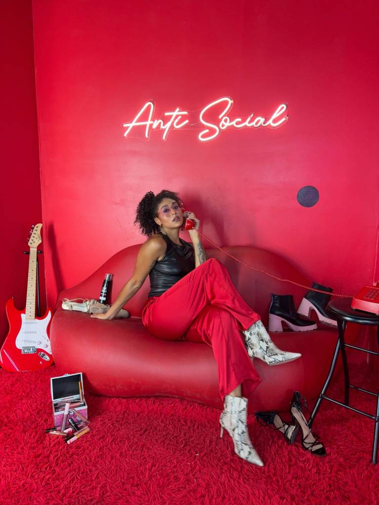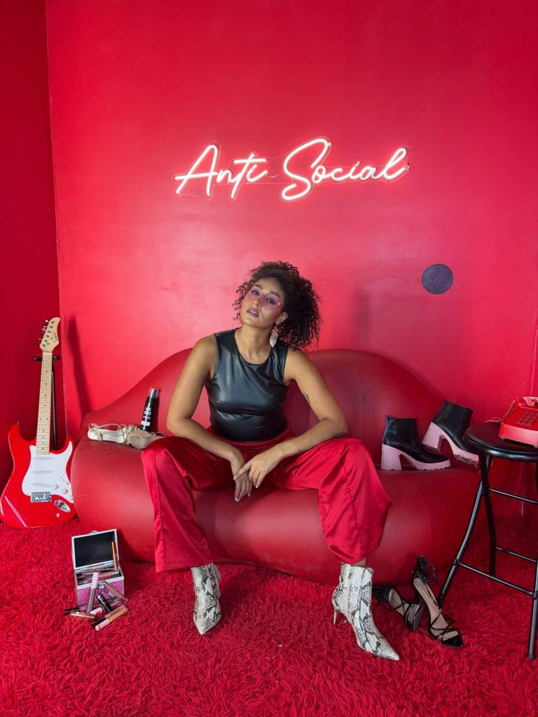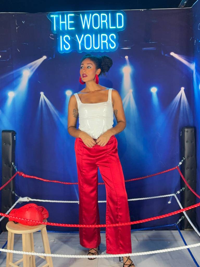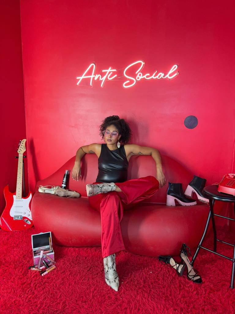 I wasn’t sure I was going to like this backdrop, but Stacey styled this look – the red satin trousers and a white latex top that I found at the Plato’s Closet in Palm Beach Gardens, Florida! I finished off the look with my go-to black strappy heels and space buns.