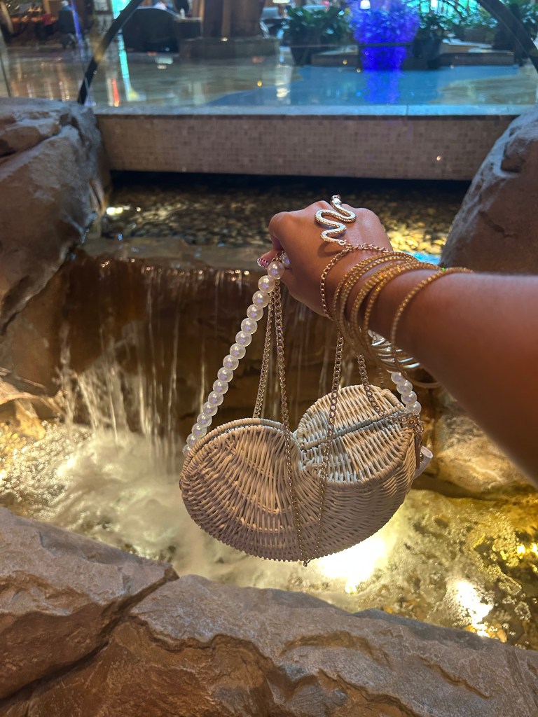 I ended up pairing a rhinestone and black velvet mini skirt with the white latex top and the snake print booties I found at Plato’s Closet, finishing off the look with a pair of pink Abella Eyewear sunglasses and the cutest little wicker bag shaped like a seashell that I found at T.J. Maxx!