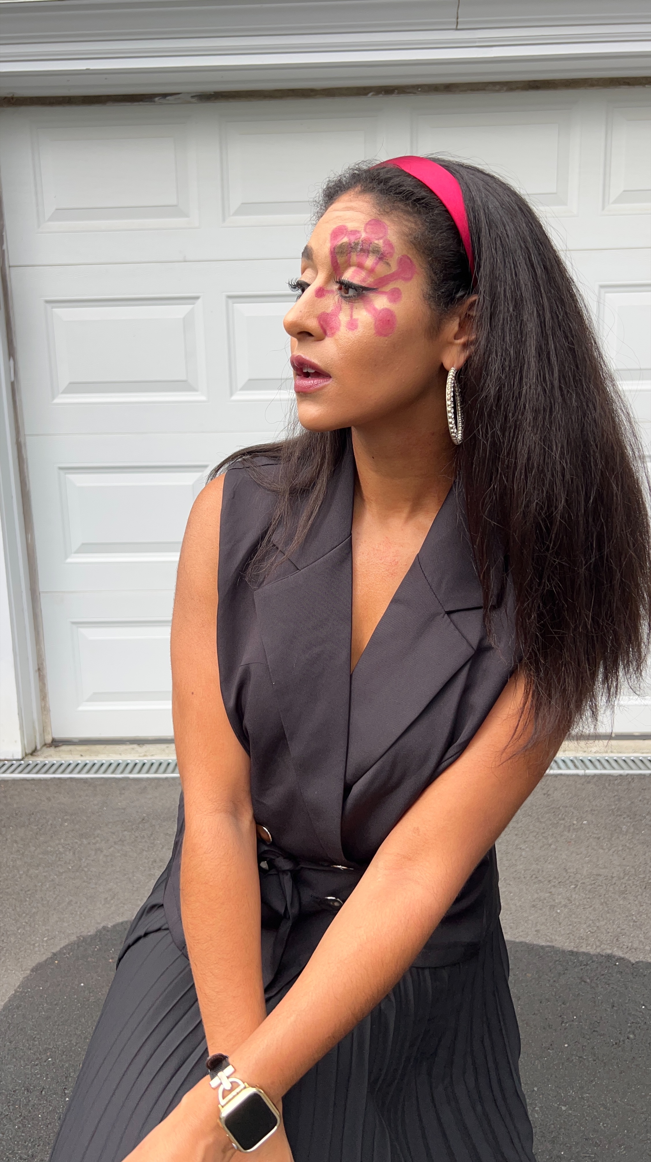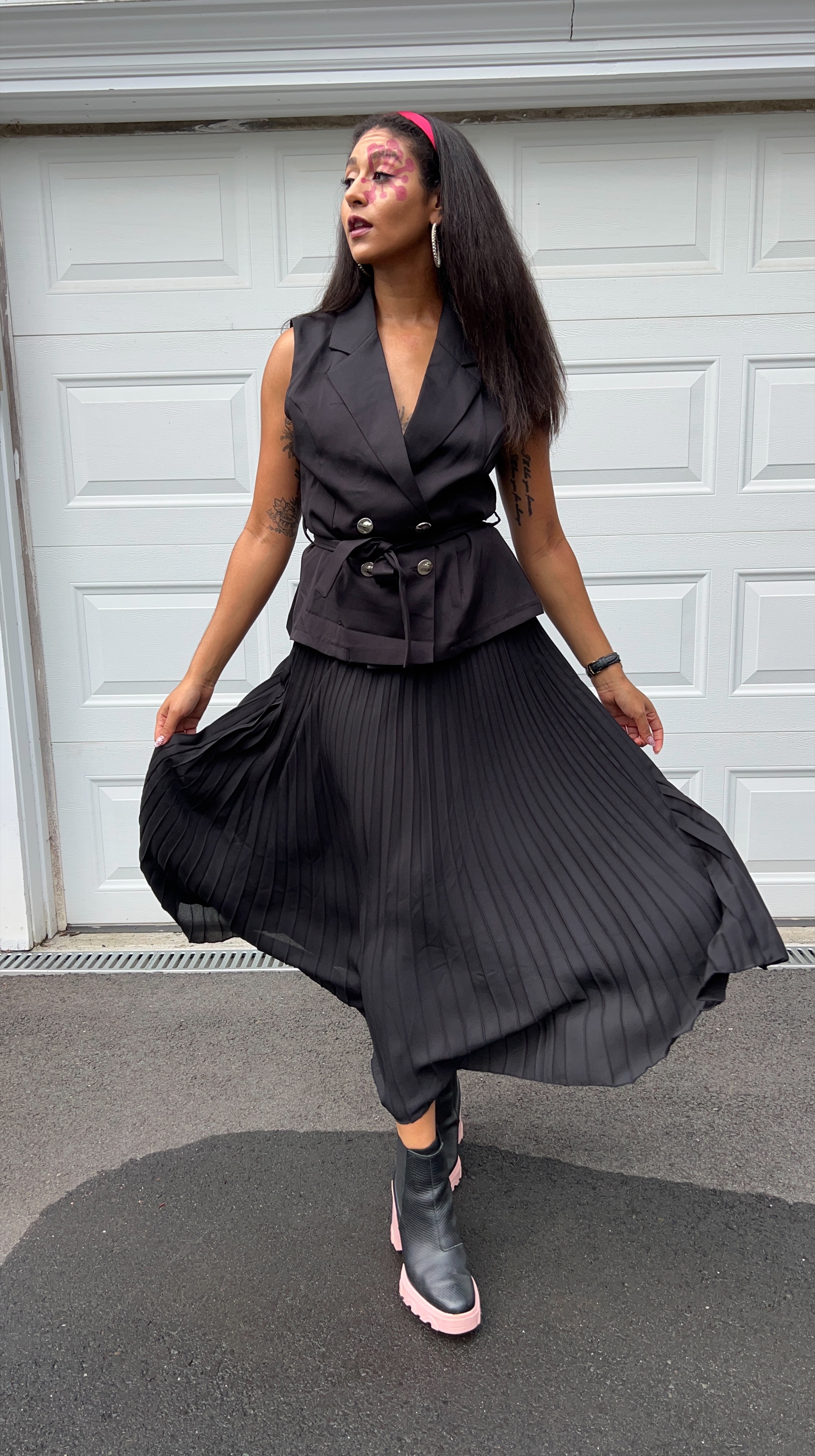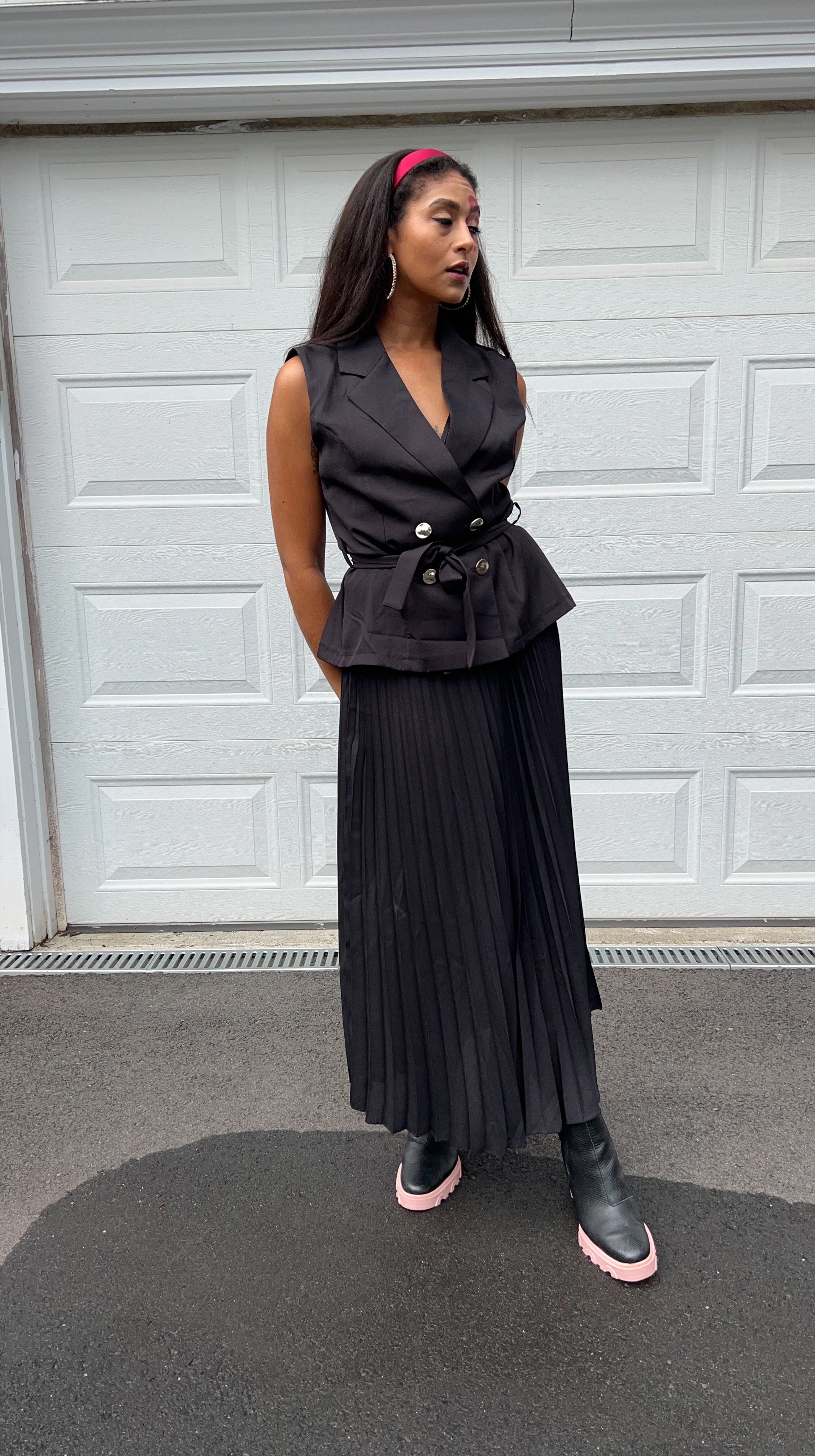 Tengen’s Hashira uniform is a black tank top and black pants, so I took a flashier approach, opting for this long-skirt-and-tank-vest combo piece that I found at Market Street Creatives in Torrington paired with the black and pink Sorell boots I got at T.J. Maxx. Even though Tengen has a jewel encrusted headband, I toned it down a notch by wearing rhinestone hoop earrings and a red headband.