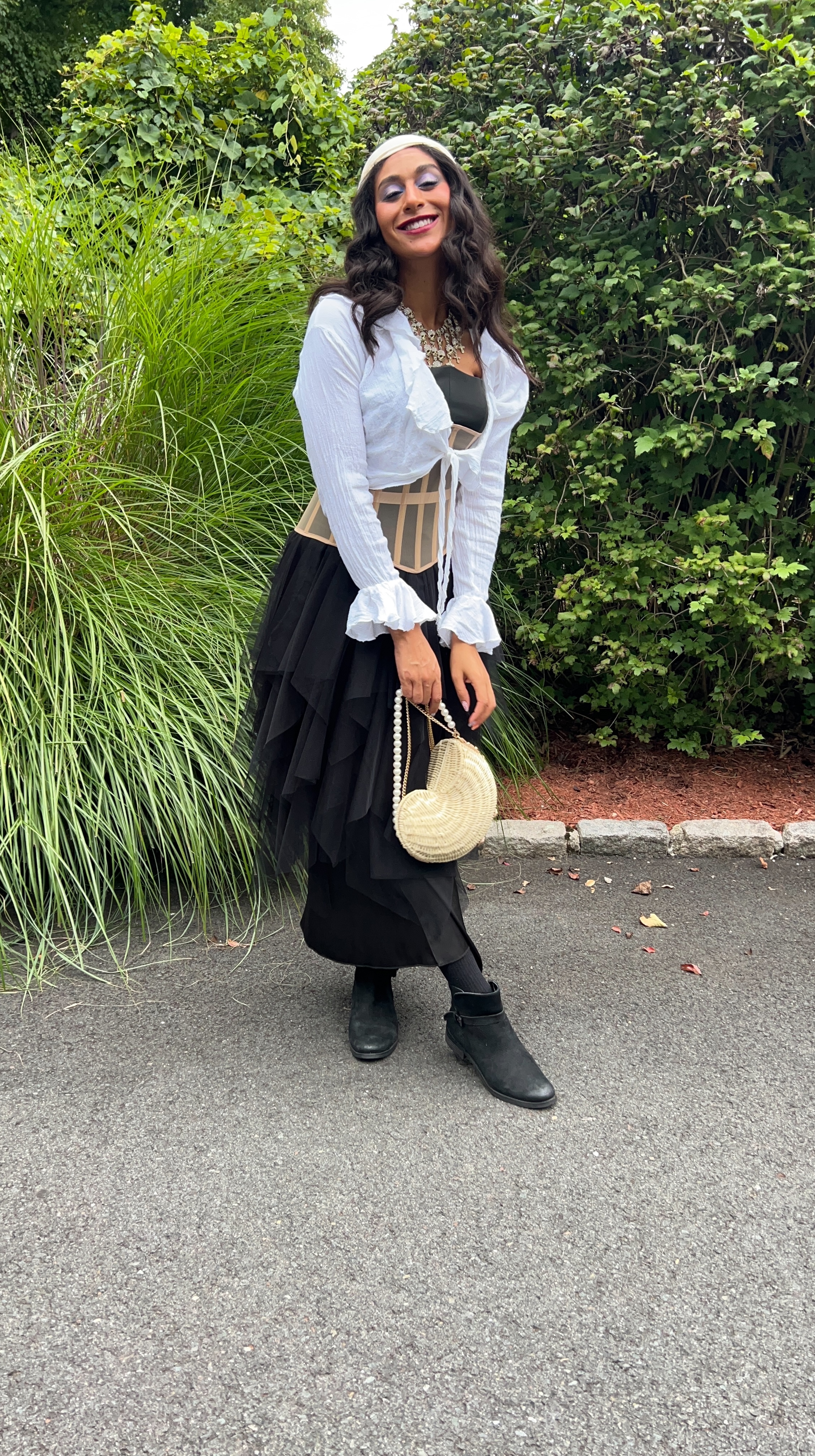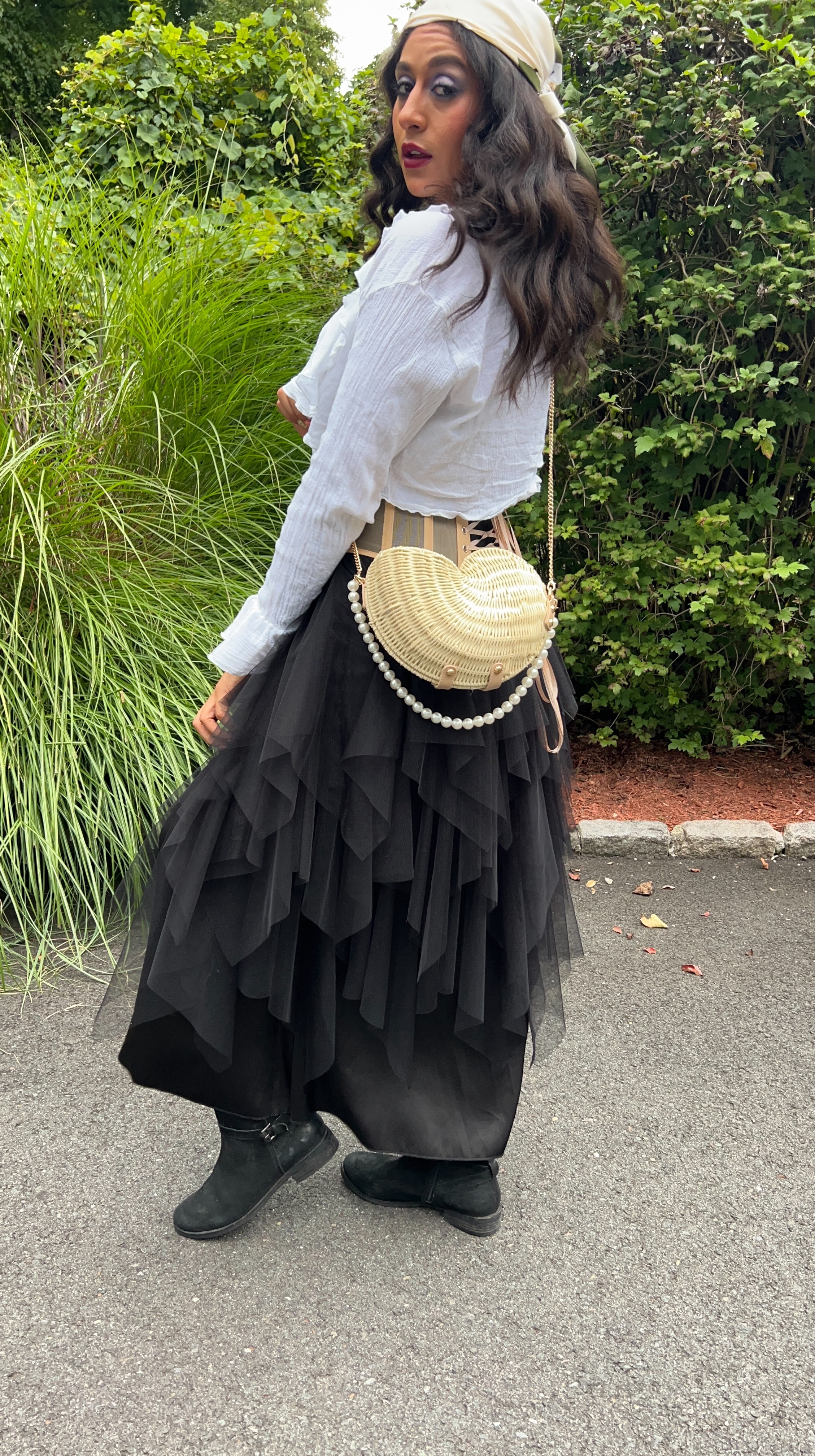 I wanted my visible accessories to be eye-catching, and opted for this giant statement necklace of rhinestone-covered skulls and crosses. Because I was going to be outside I picked a flat pair of black motorcycle boots and a pair of black kneehigh socks. And I finished off the look with the most adorable seashell shaped wicker bag that I found at T.J. Maxx!