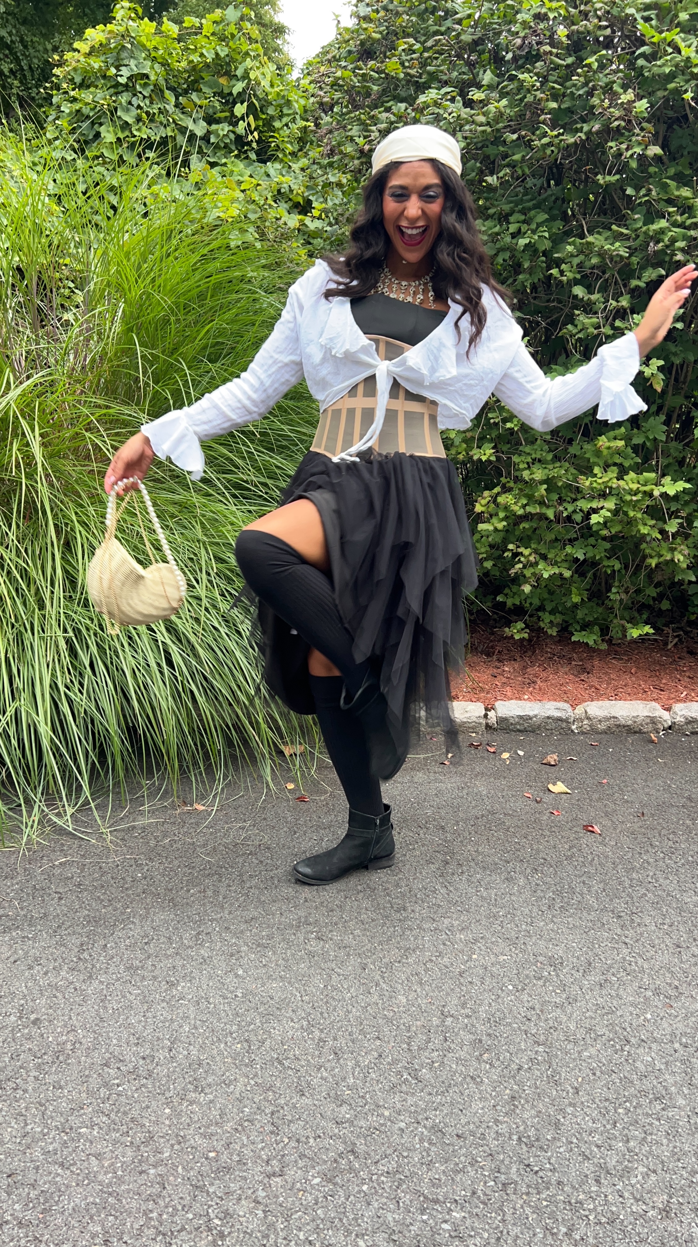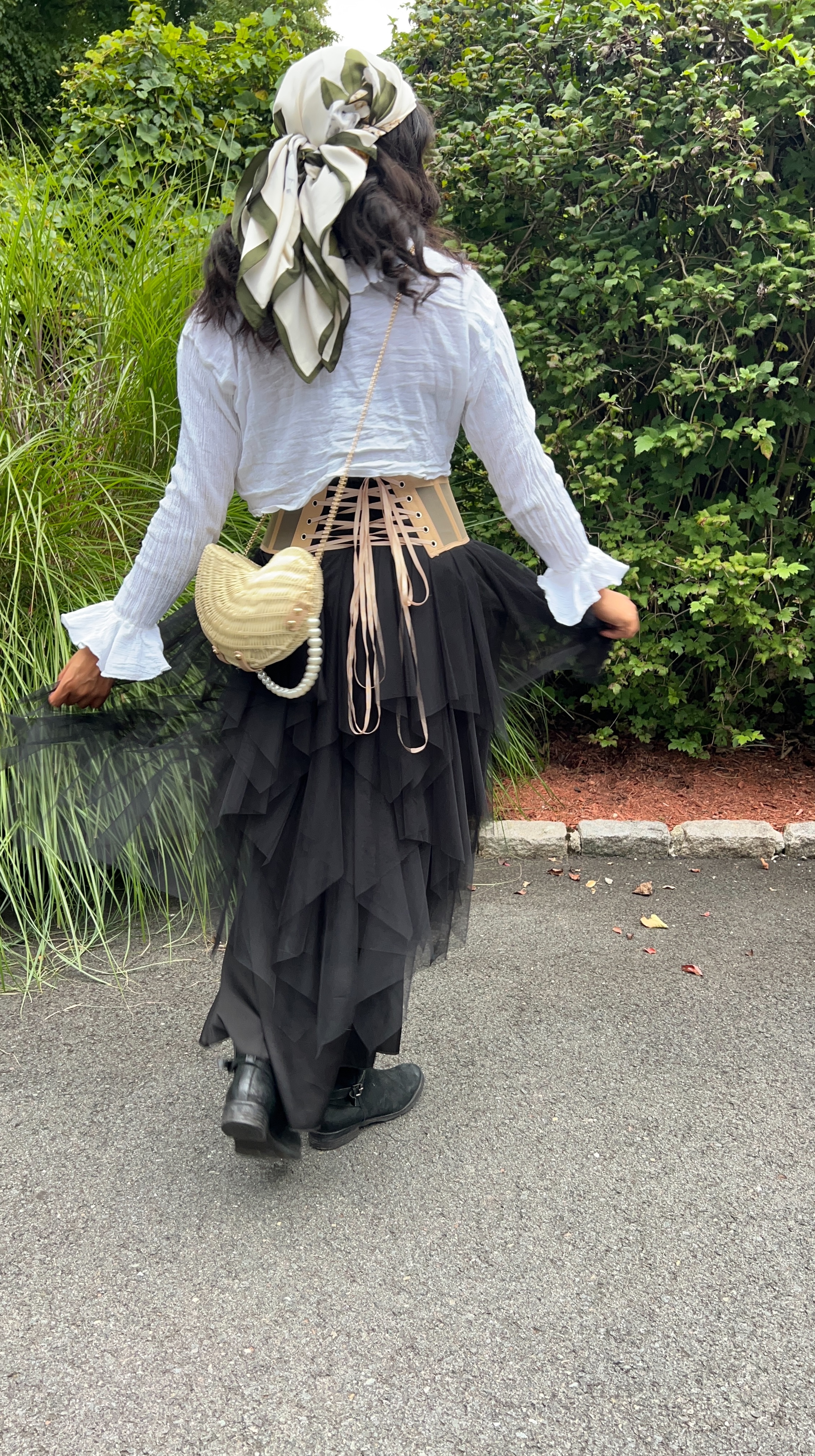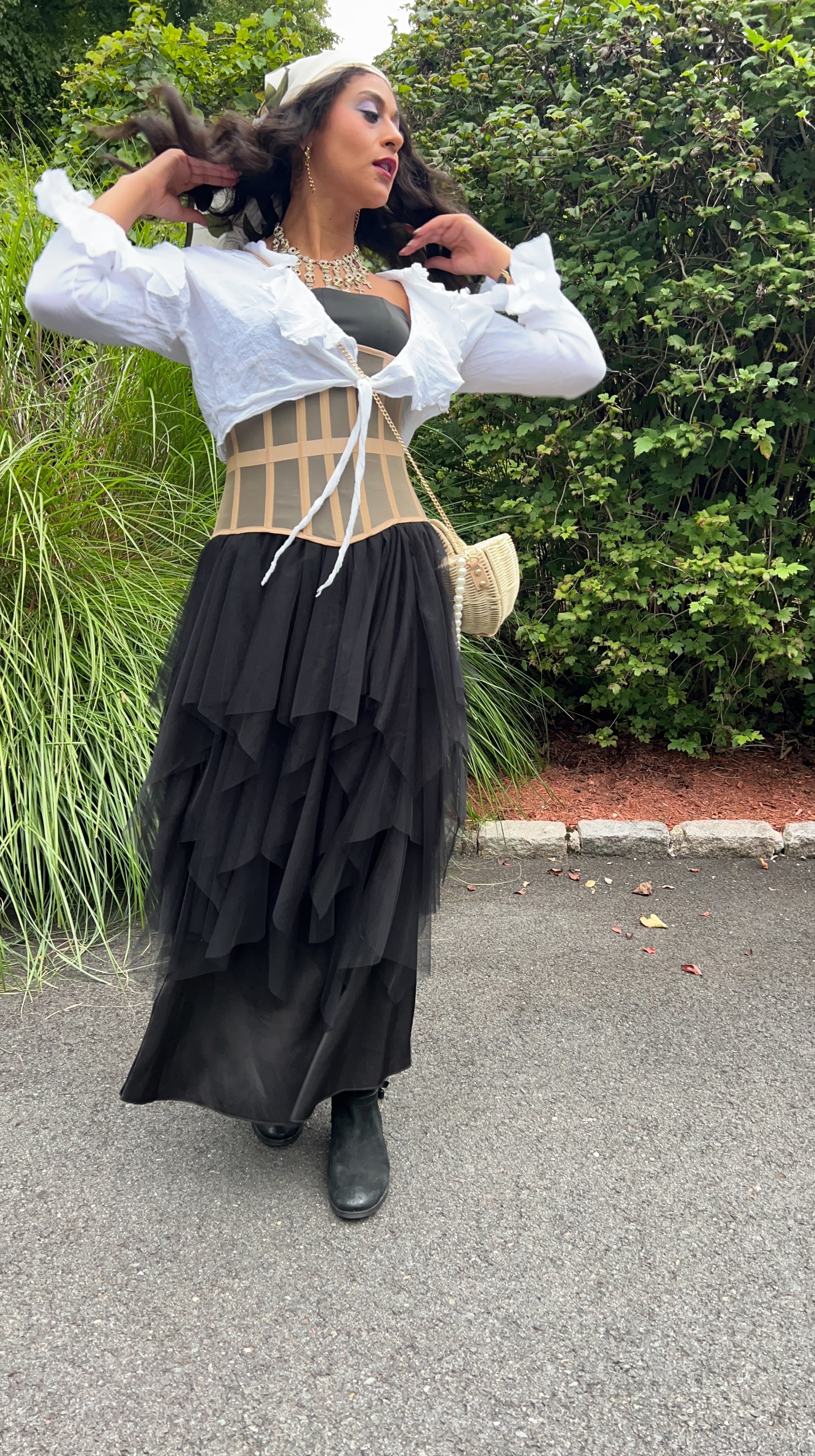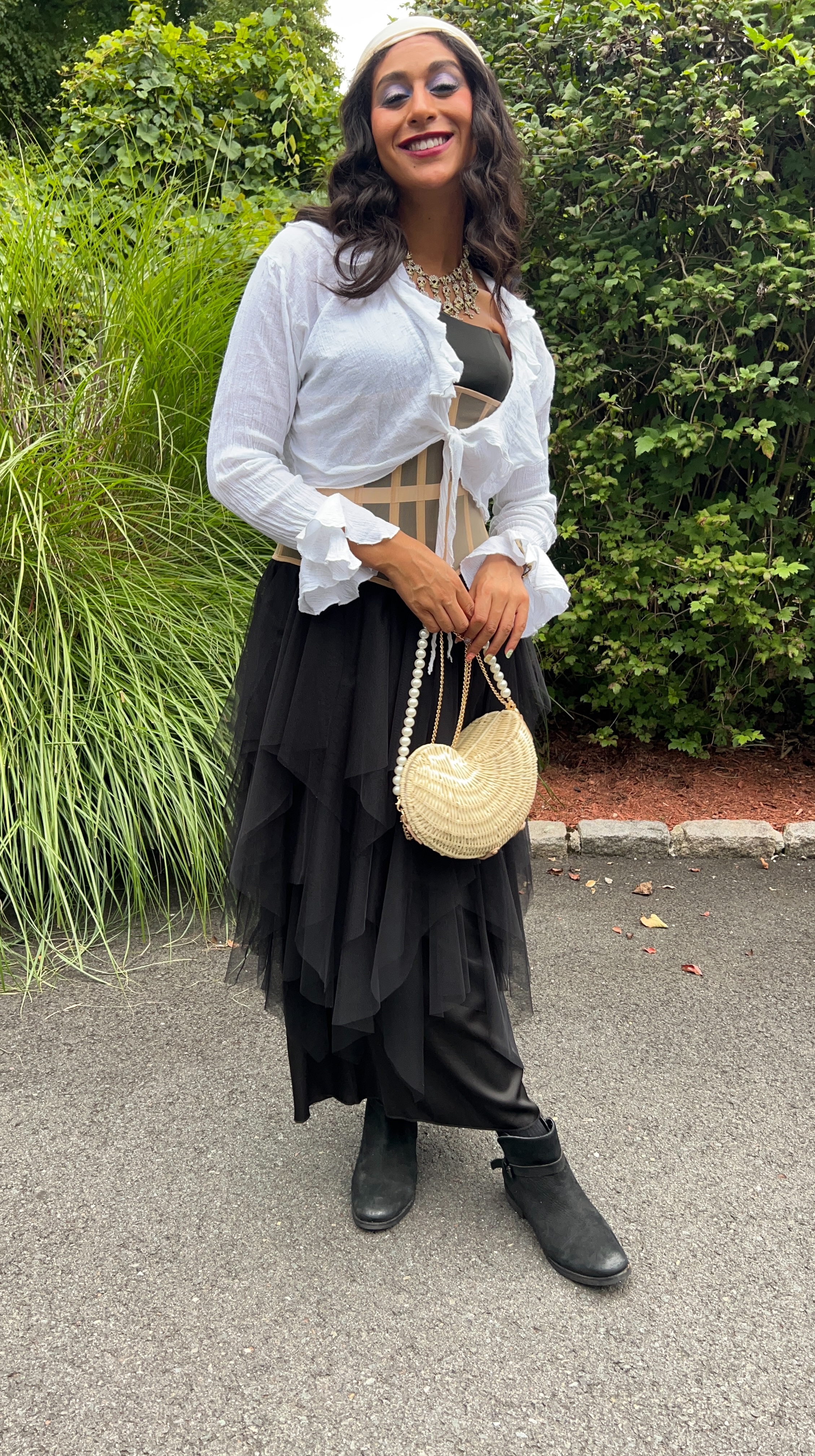 Because I originally created this look to attend the Renaissance Faire with one of my work friends – and it was a rainy night – I decided strategic layering would be the best option. Much to my own dismay, I used the Lavish Ivy dress as my base layer, which I dressed up with the black tutu skirt I bought at Renee’s Resale Clothing Outlet, a corset my mom let me borrow, and a frilly white, tie-front top!