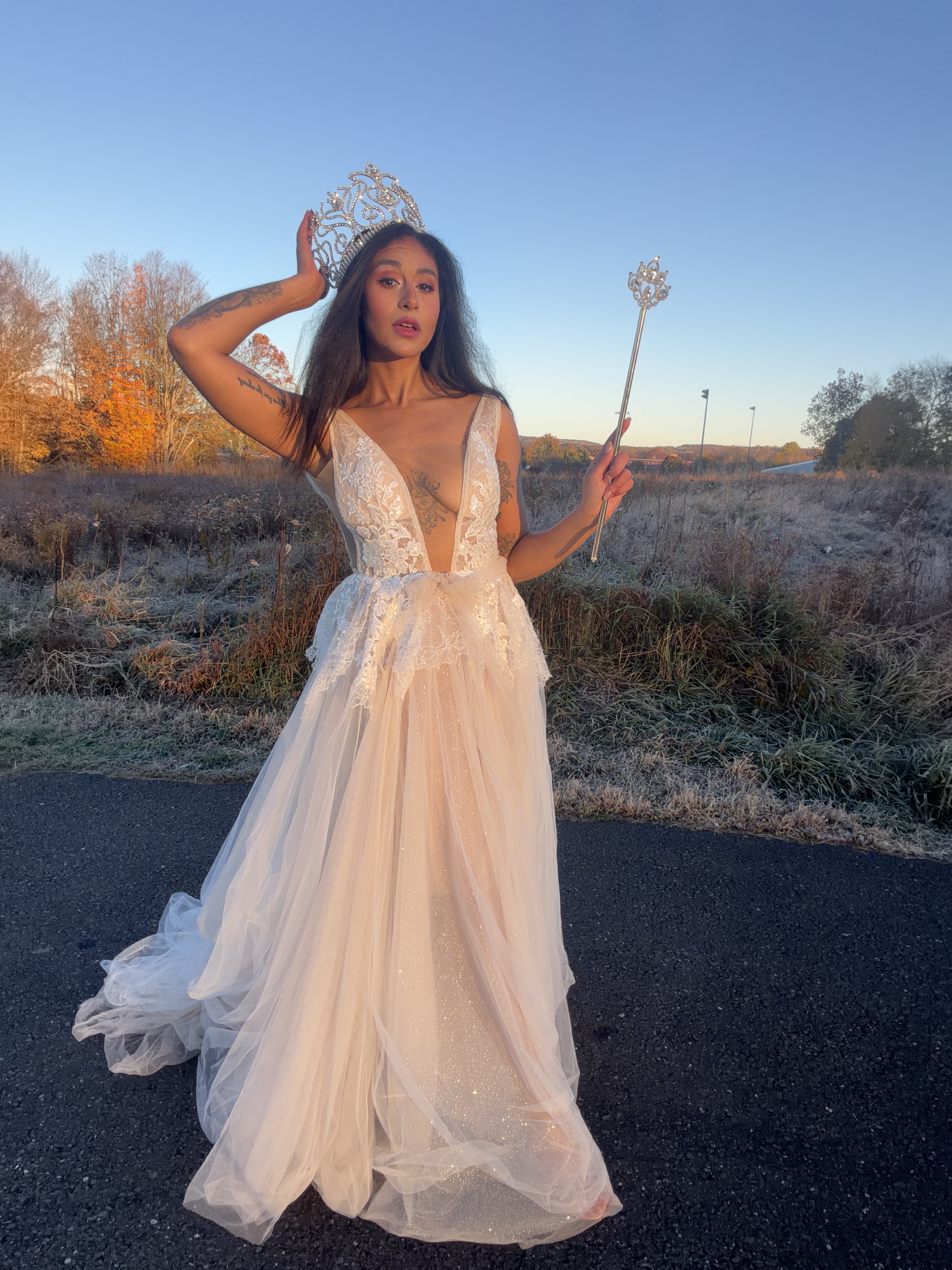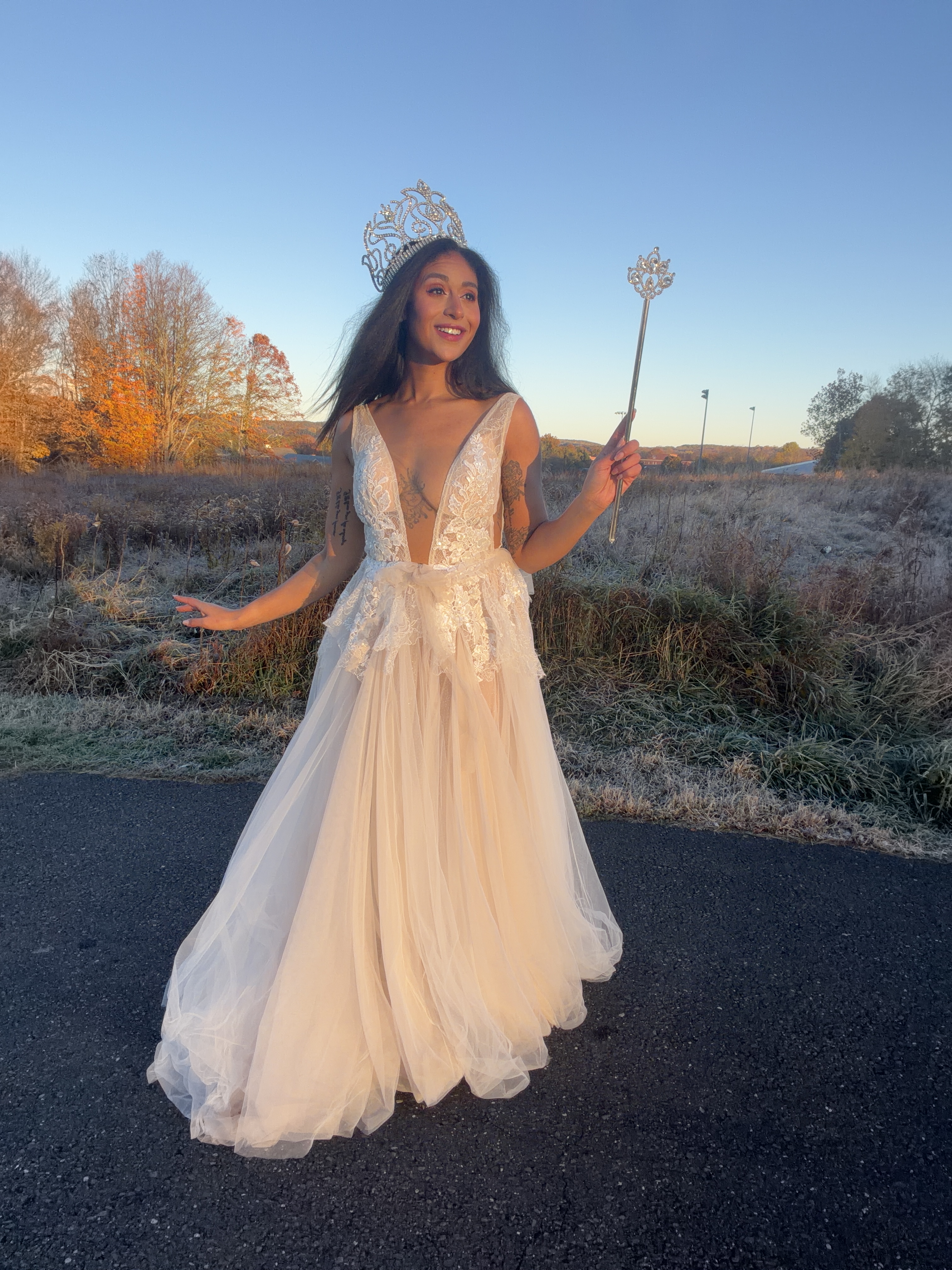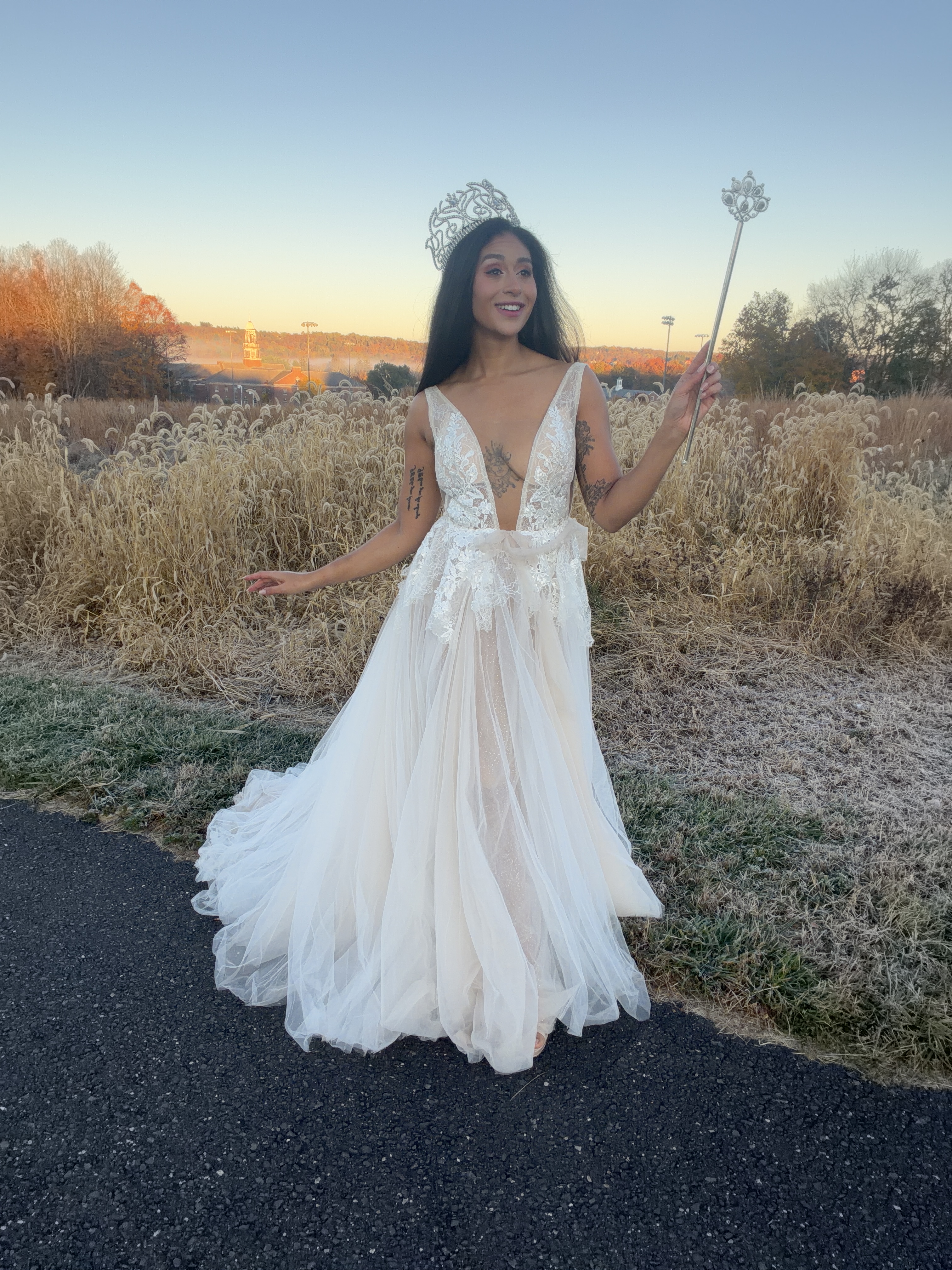I finished off Glinda’s iconic look with a crown and sceptre that I had won in two separate pageants. But my vision really came together once I got on location for this photo shoot – sunrise at Fairfield Hills!