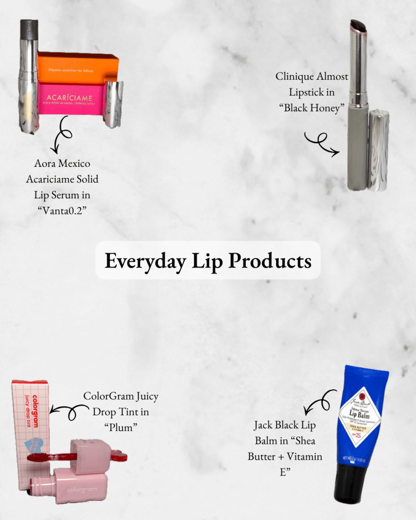 I’ve been rotating between these four products for lips and I have to say, I’m obsessed! First up is my tried-and-true, the Jack Black Lip Balm in the Shea Butter and Vitamin E formula – truly the most hydrating, healing, and nourishing lip product on the market! Next up is my favorite for adding a splash of color – Clinique’s Almost Lipstick in the iconic shade, Black Honey! This formula is super buildable, starting at a soft berry hue and ending in a deep cherry red! When I’m temporizing between lip balm and lipstick, I reach for Aora Mexico’s Acariciame Solid Lip Serum in shade “Vanta0.2” or the ColorGram Juicy Drop Tint in shade “Plum”.