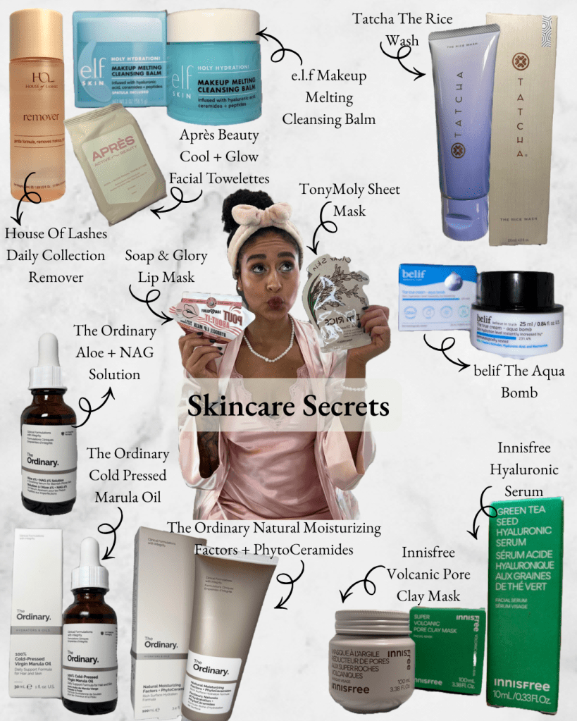 When it comes to my skincare routine I don’t mess around! My everyday products include: the Tatcha Rice Wash, the Belif True Cream Aquabomb, The Ordinary Aloe + NAG Serum, Ponds Dry Skin Cream, and the Innisfree sunscreen!