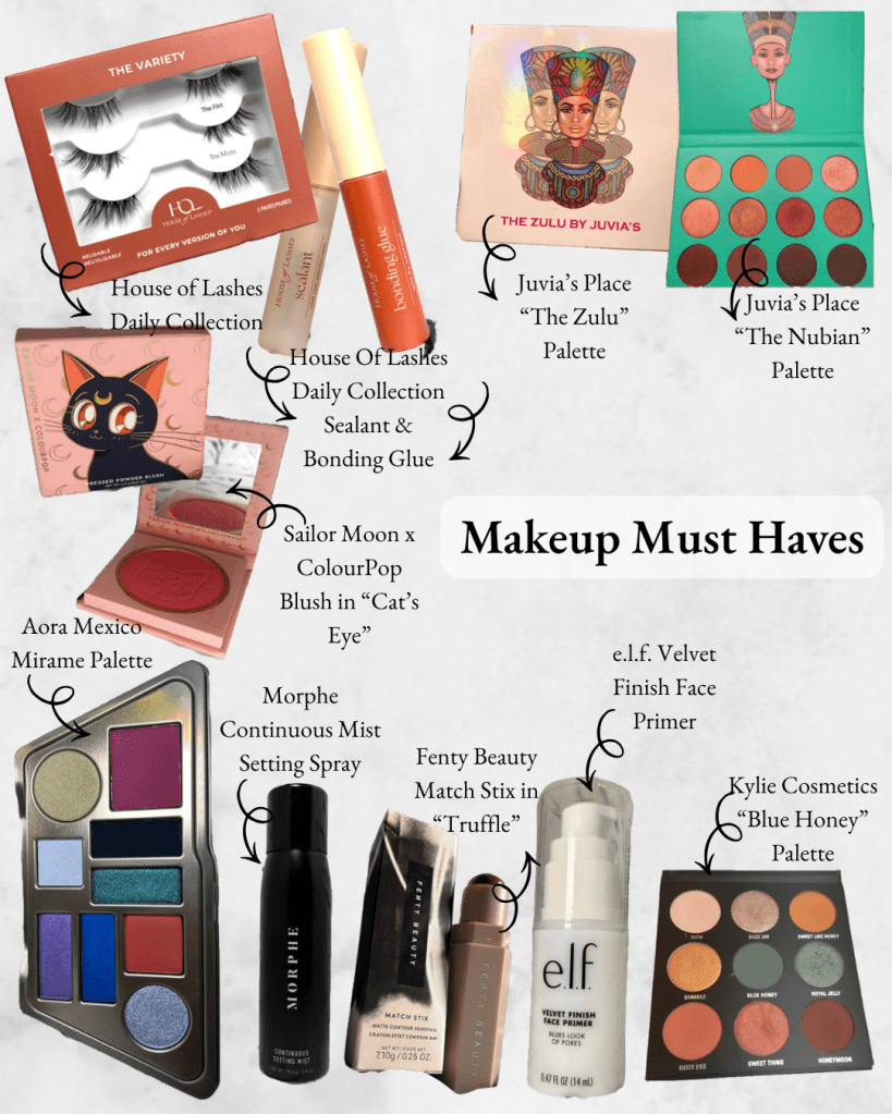 And finish up with captivating eyeshadows and lipsticks! Lately I’ve been reaching for a few eyeshadow palettes – the Aora Mexico Mirame palette; the Juvia’s Place The Zulu; and the Kylie Cosmetics Blue Honey palette – that are different from my tried and true palettes – the ColourPop Limoncello; the Sailor Moon x ColourPop Pretty Guardian Sailor Moon; the ColourPop Of Quartz; the Juvia’s Place The Nubian; and the Morphe 35H Hot Spot Artistry palette. For eyeliner I go back and forth between the NYX Cosmetics Eye Pencil in shade “Black” and the Stila Stay All Day Waterproof Liquid liner in shade “Black”.