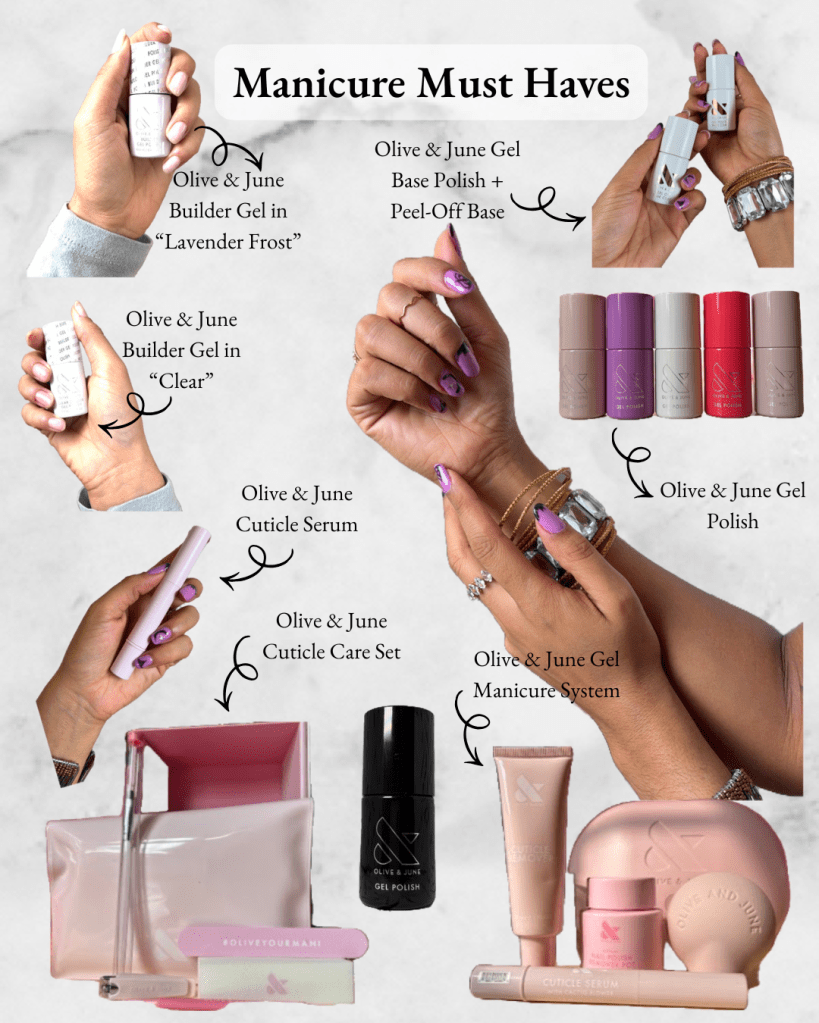 Olive & June has been my saving grace! Not only do they offer salon quality gel polishes and gel curing lamp, they also have a Peel Off Gel Base which makes it easy to change my manicure without excessive filing. Part of what makes a manicure last is properly prepping and caring for your cuticles – when I’m out and about I keep Olive & June’s Cuticule Serum pen in my purse, and before bed each night I apply a sizable amount of the Sally Hansen Vitamin E Cuticle Oil.