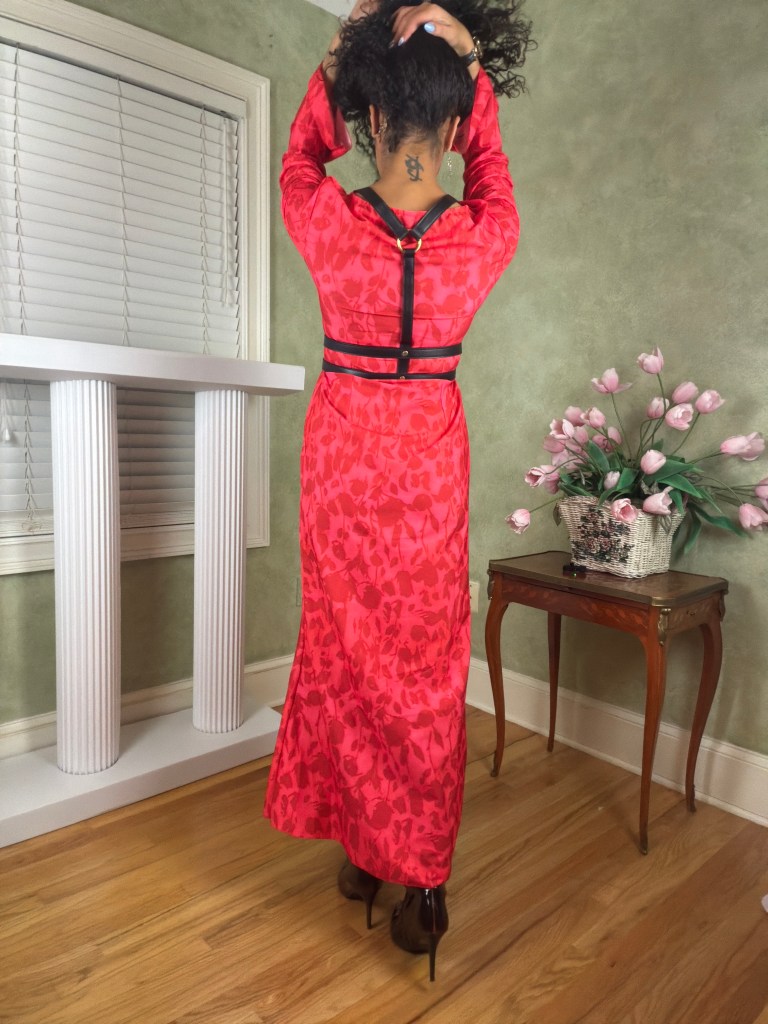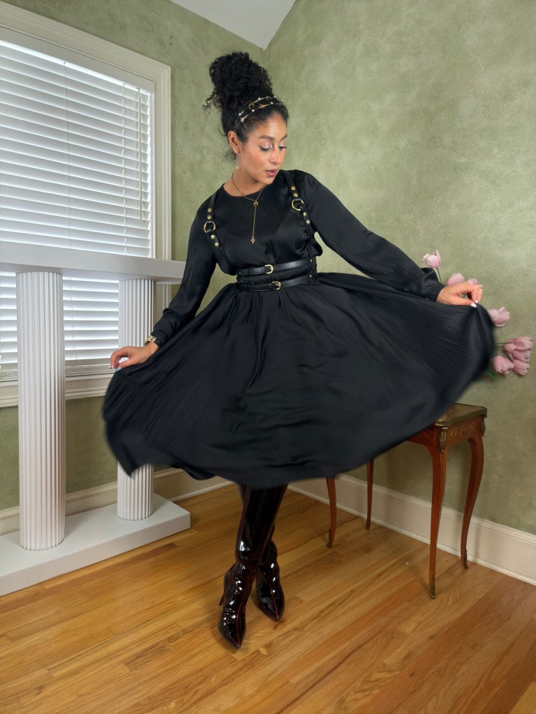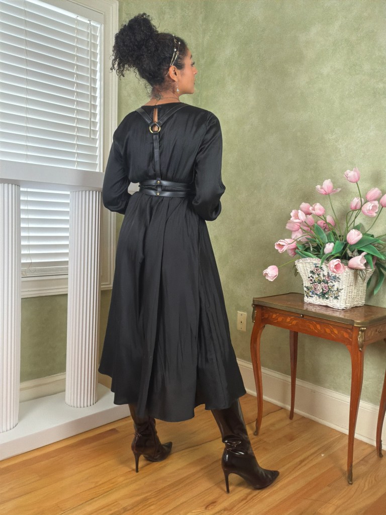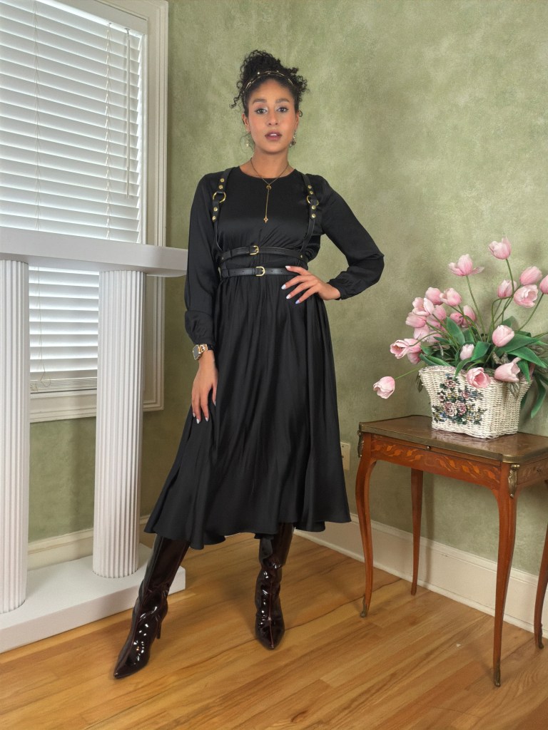 Immediately after unboxing I knew I wanted to wear the harness to work, but thought the red maxi dress would be a bit much for a Monday morning. Instead I opted for an oversized black satin dress from Zara with a pair of deep burgundy faux patent leather boots from Windsor.