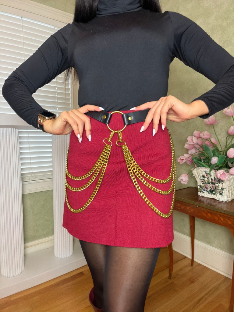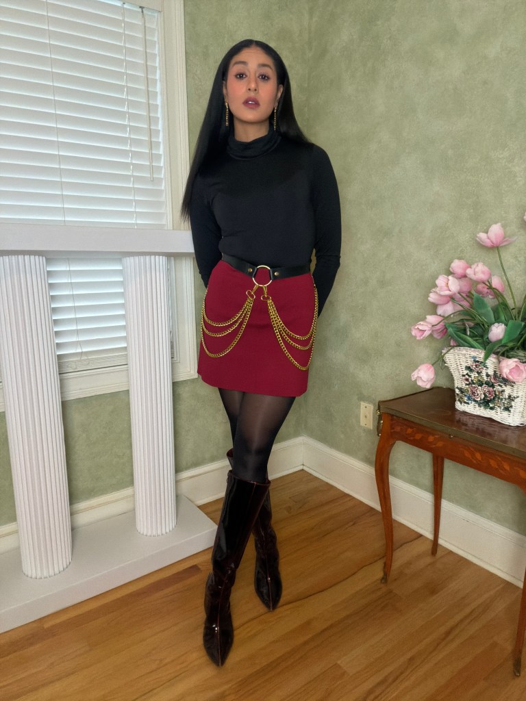 Most recently I broke out the Poised Opulence belt! To really let this piece take center stage I kept my base layers simple – a black turtleneck bodysuit, sheer black tights, a maroon mini skirt from Zara, and the Windsor boots. I added the belt, and ended up taking off the cross accent.