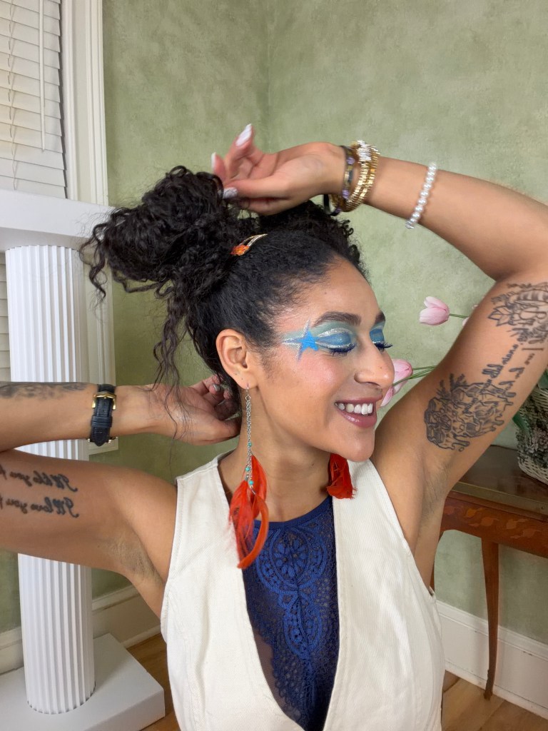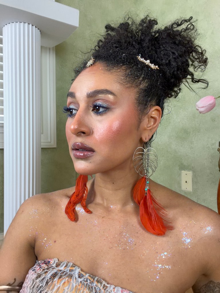 These colors are incredibly flattering on my hazel-eyed and red-haired mother, not as much on my olive toned skin! I used the pink eyeshadow shade, the Flounder “highlighter”, and the lip oil in my Earth Day makeup look, and used the neutrals shades + the sparkly blue to create this look to attend the 2026 Vintage Market Days of Connecticut event.