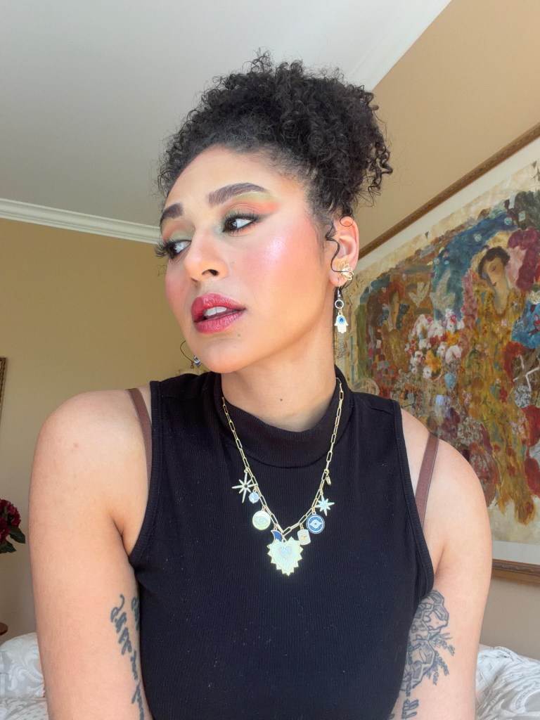 I’m wearing the Ursula lip kit with the lip oil in these photos, which I do like but it’s brighter than I’d usually go; and honestly I wasn’t a fan of the highlighters, they functioned more like a pressed glitter than a true highlighter.